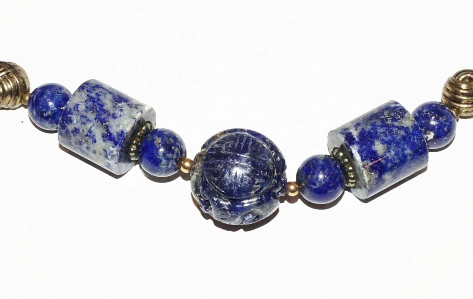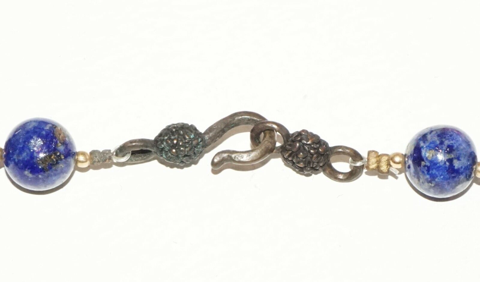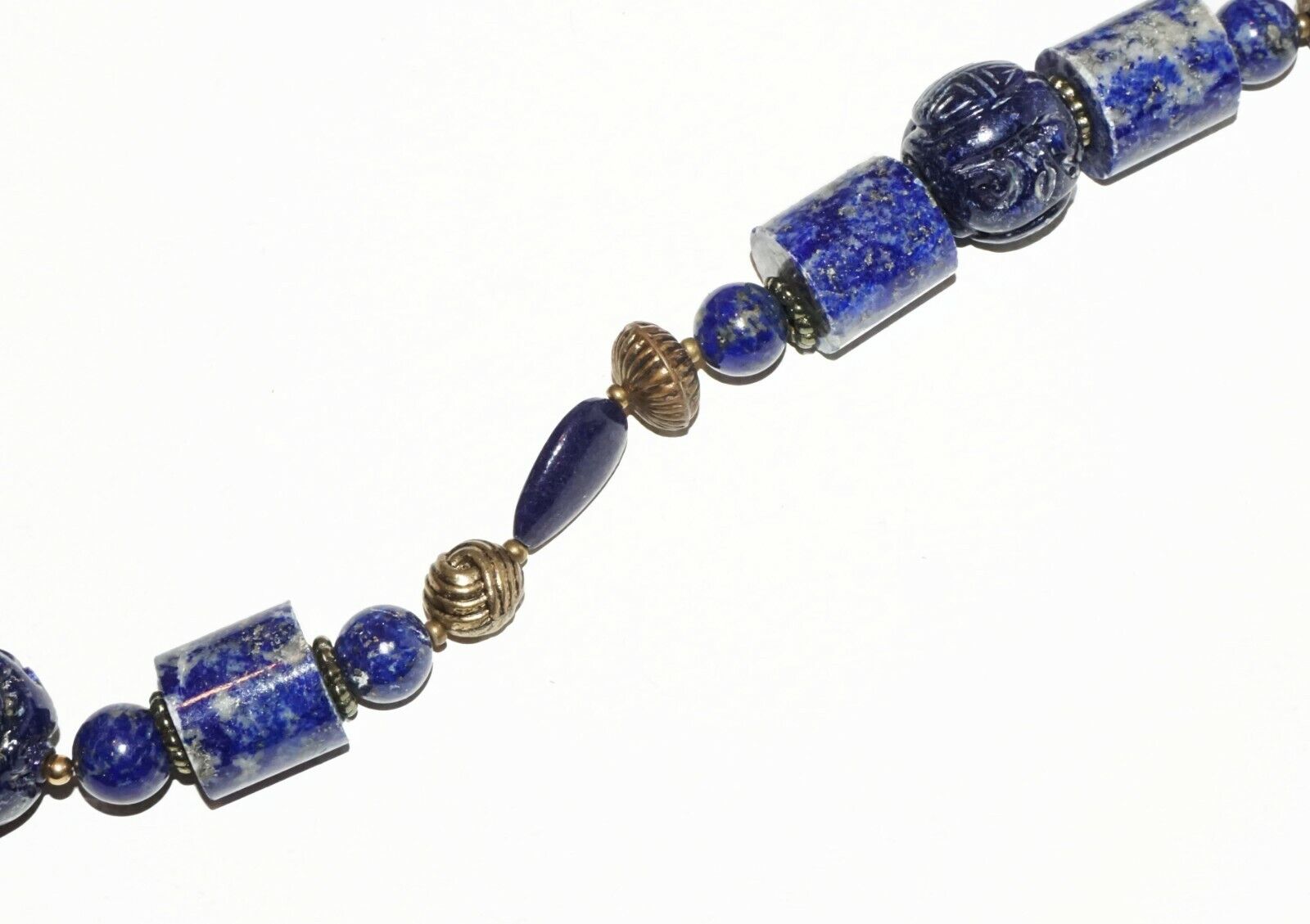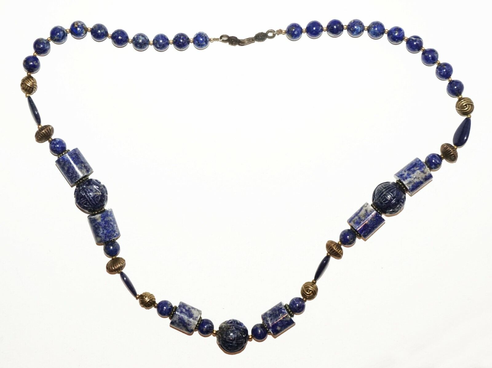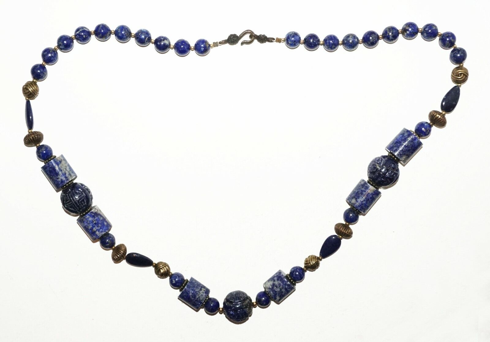 Up for sale from a recent estate in Honolulu Hawaii this Vintage Chinese style lapis lazuli plain and carved bead (beads range from 10mm to 20mm in diameter) necklace with some metal bead accents. The condition is described above for more information please check the photos.