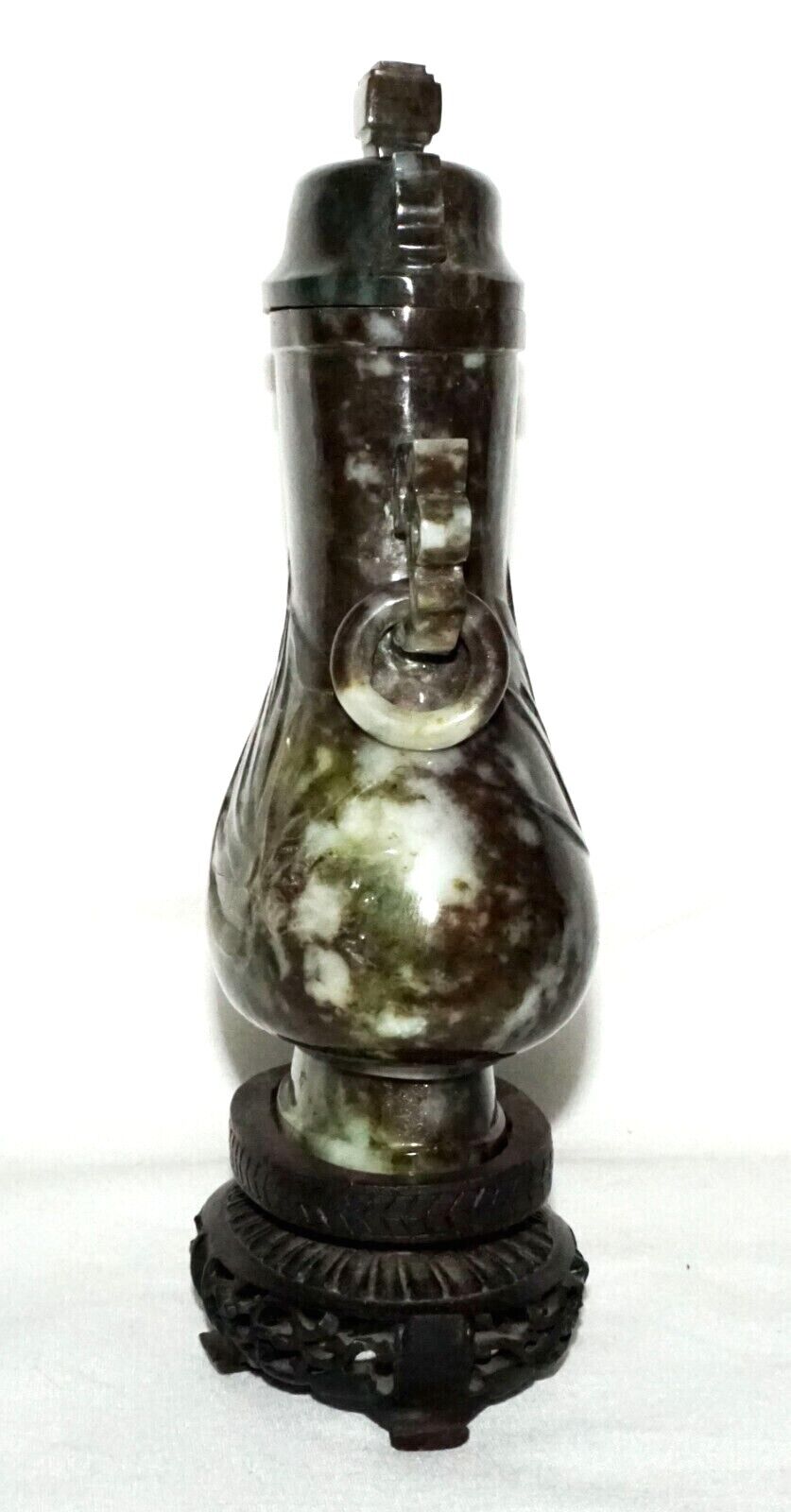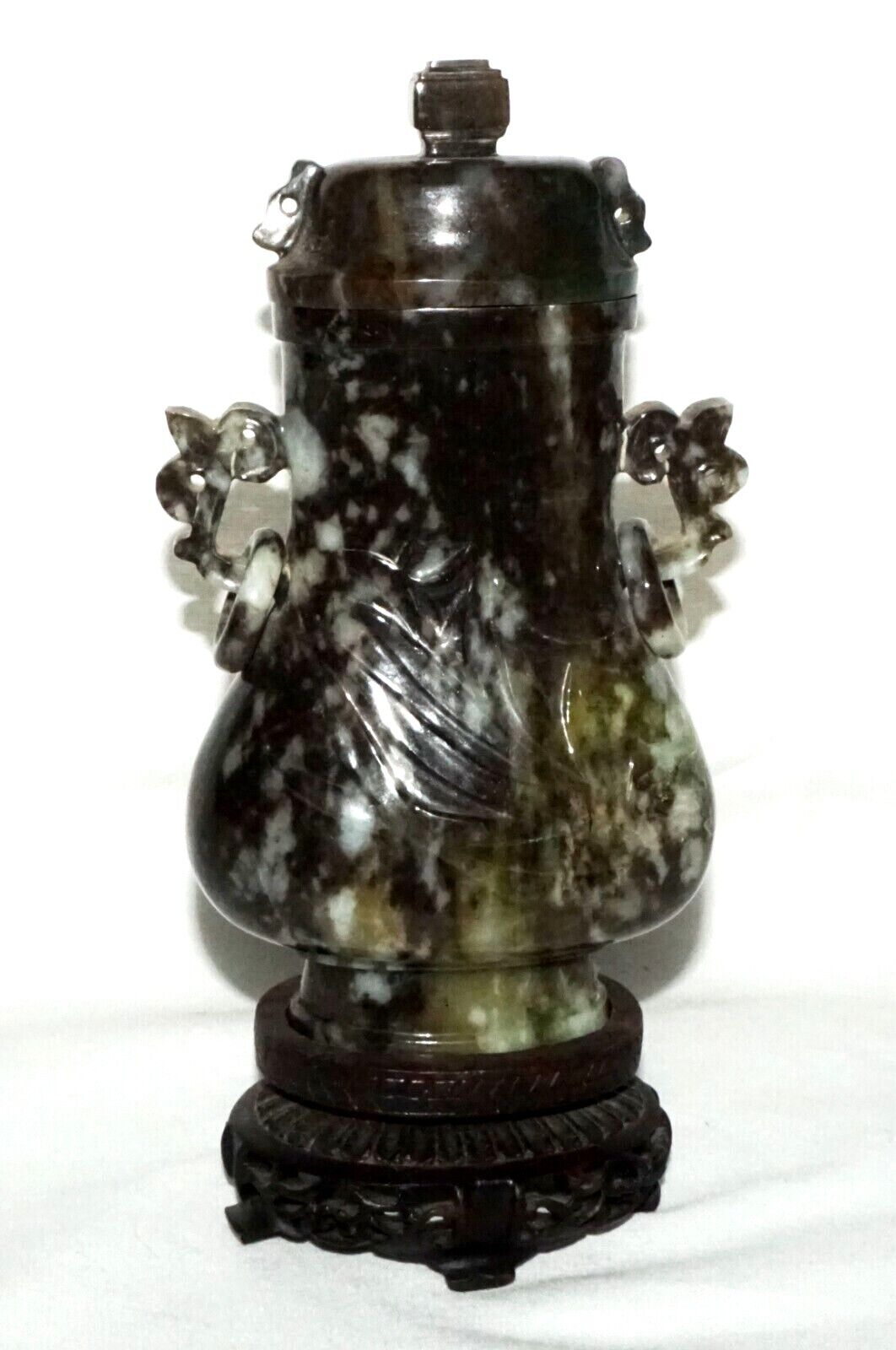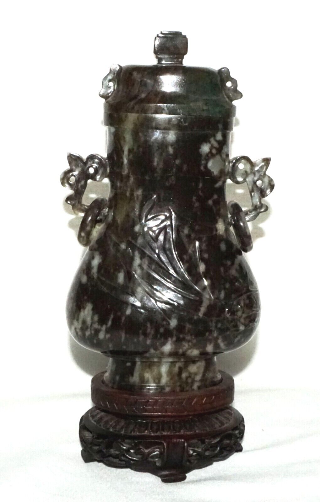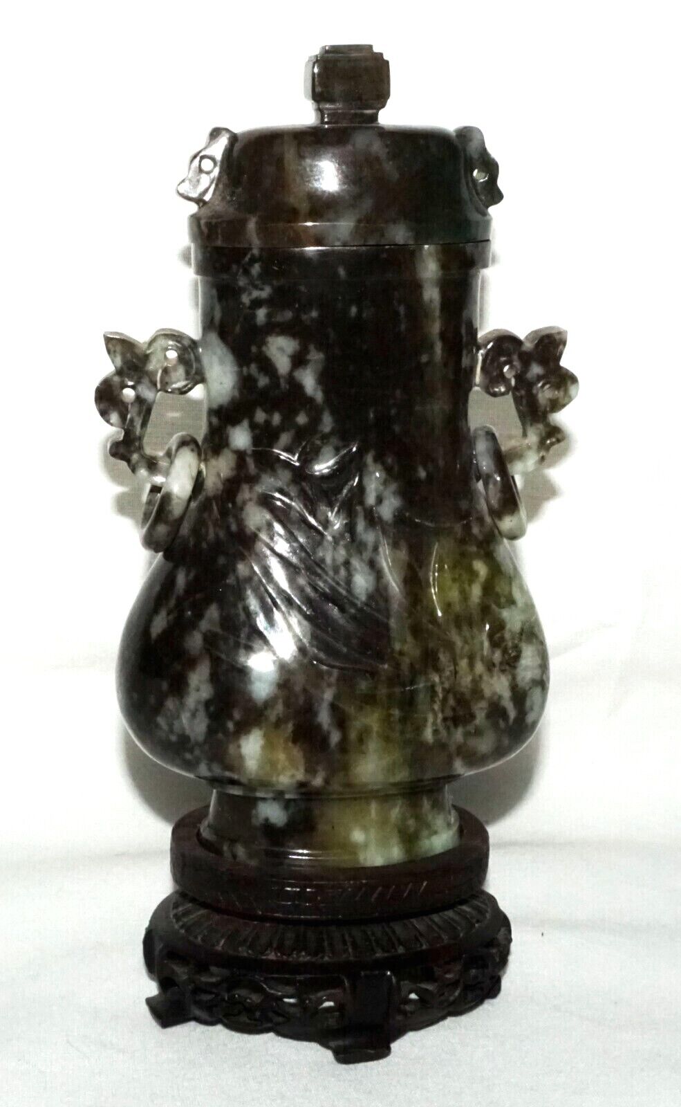 Up for sale from a recent estate in Honolulu Hawaii, this Vintage Chinese mottled mottled black and dark green jadeite jade baluster covered vase decorated with orchid designs, the sides with rui fungus handles each supporting a loose ring all coming on a fitted hardwood stand. The condition is described above for more information please check the photos. Free local pick up possible!!!