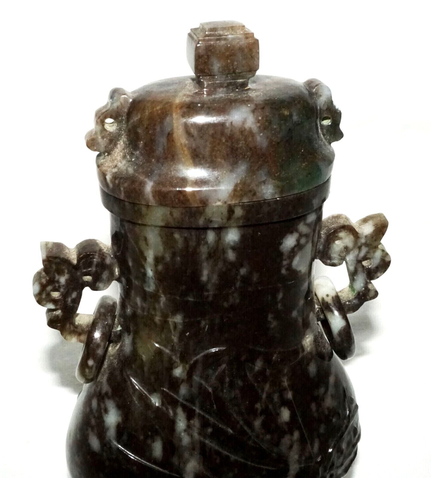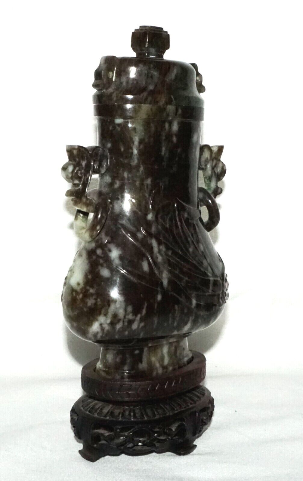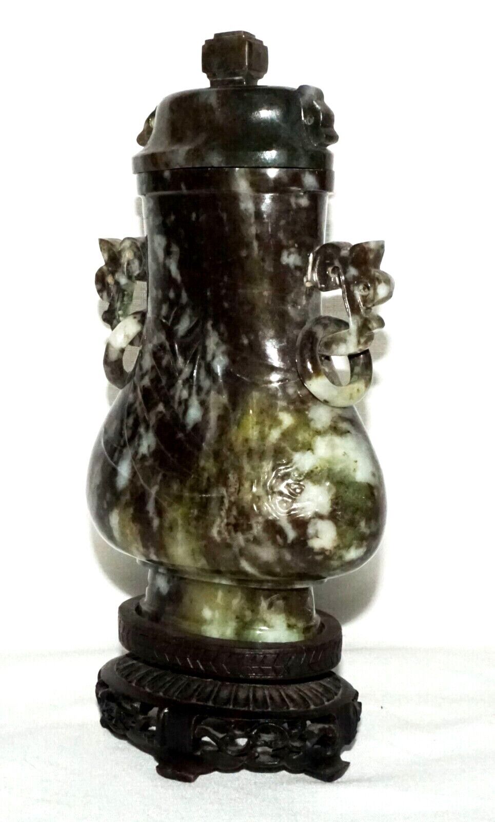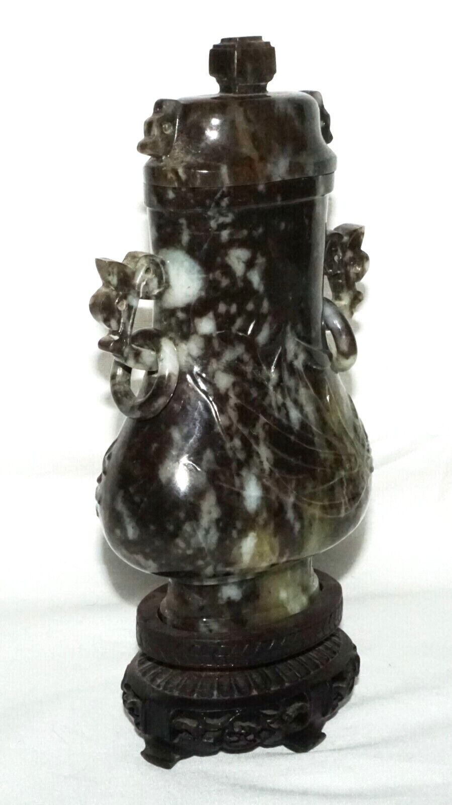 Up for sale from a recent estate in Honolulu Hawaii, this Vintage Chinese mottled mottled black and dark green jadeite jade baluster covered vase decorated with orchid designs, the sides with rui fungus handles each supporting a loose ring all coming on a fitted hardwood stand. The condition is described above for more information please check the photos. Free local pick up possible!!!