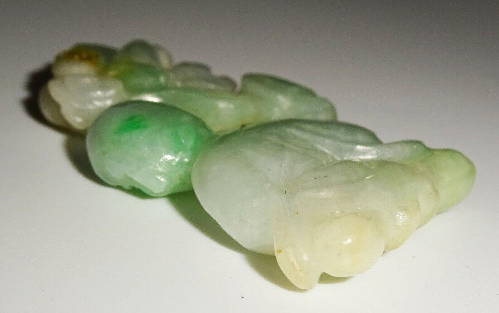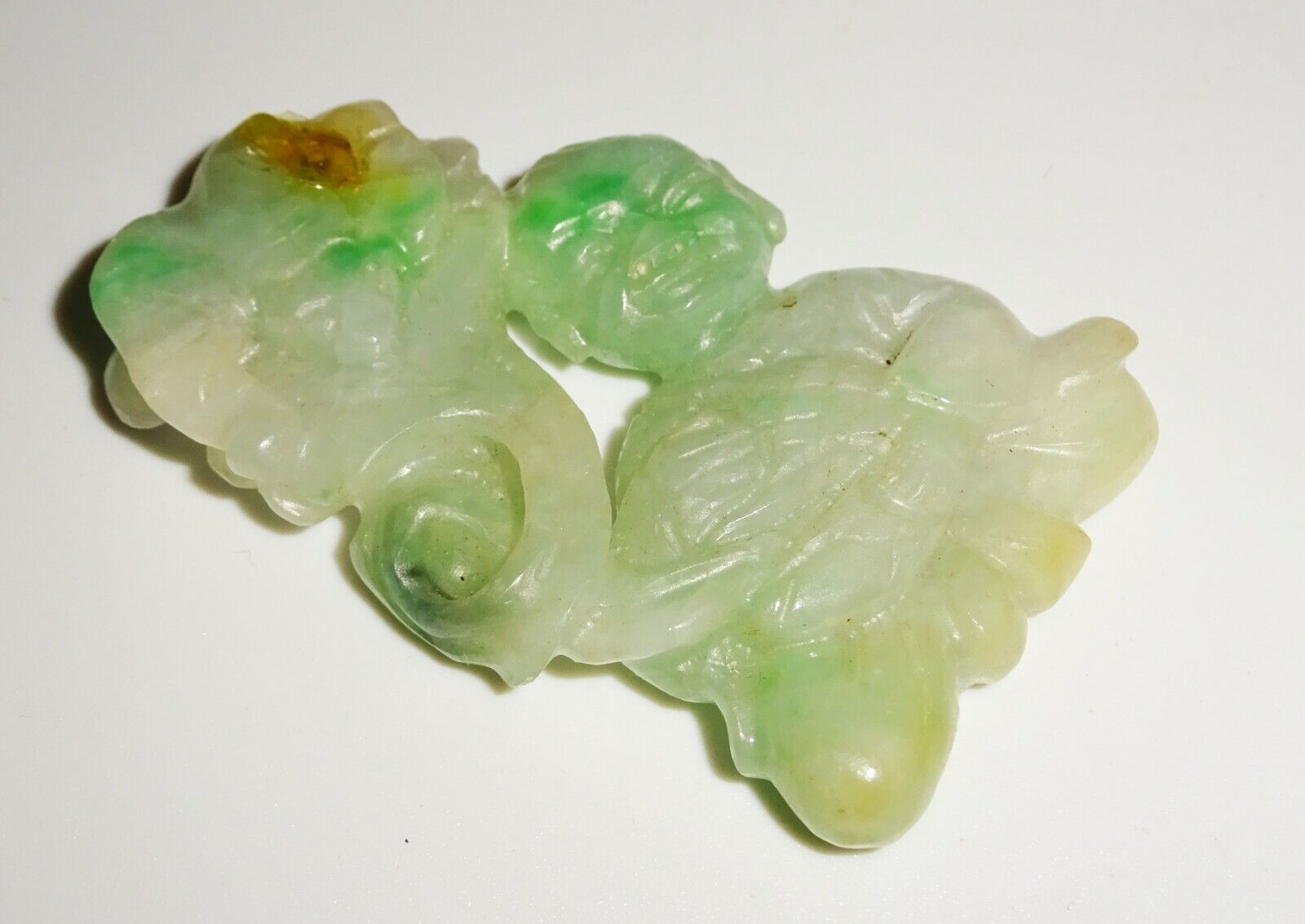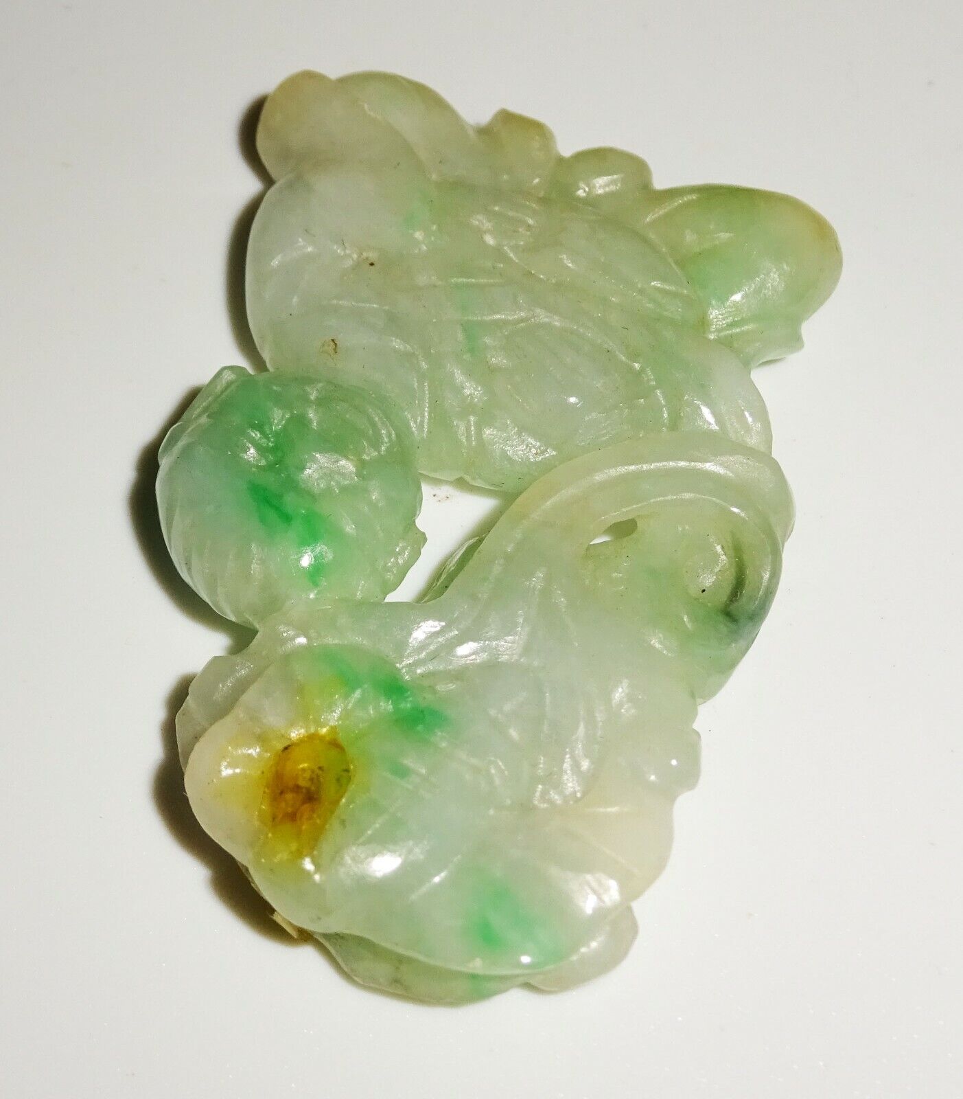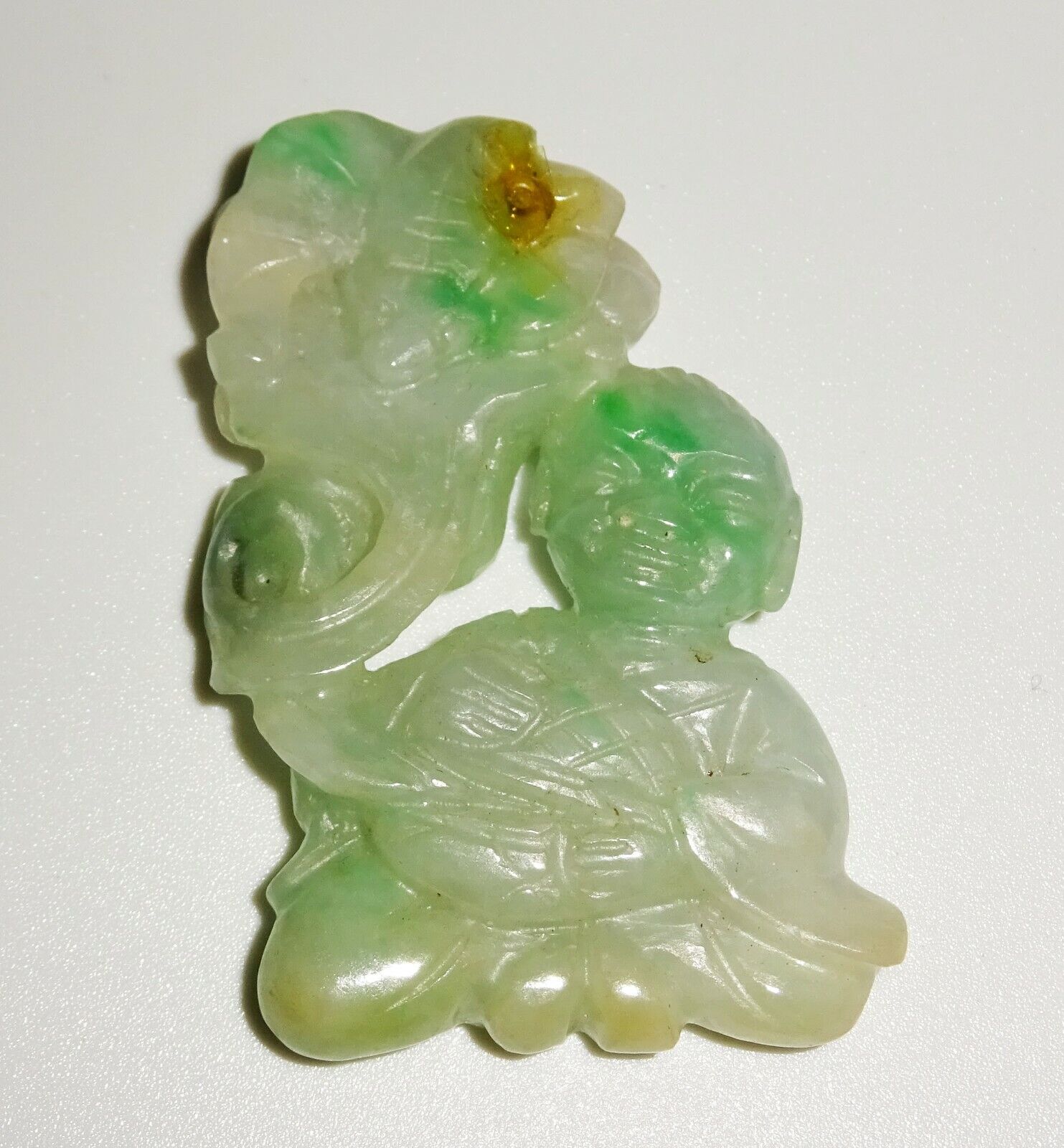 The carving is overall in good pre-owned condition, the stone was tested and is jade, the pendant bail is missing and there is some glue residue visible where it was formerly located, the piece is approx. from the 1970s, we are unable to test if the jade was enhanced in any way