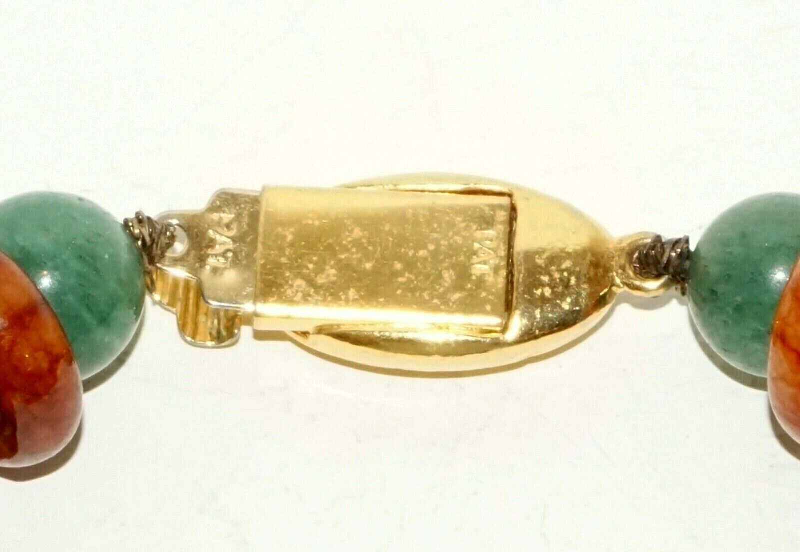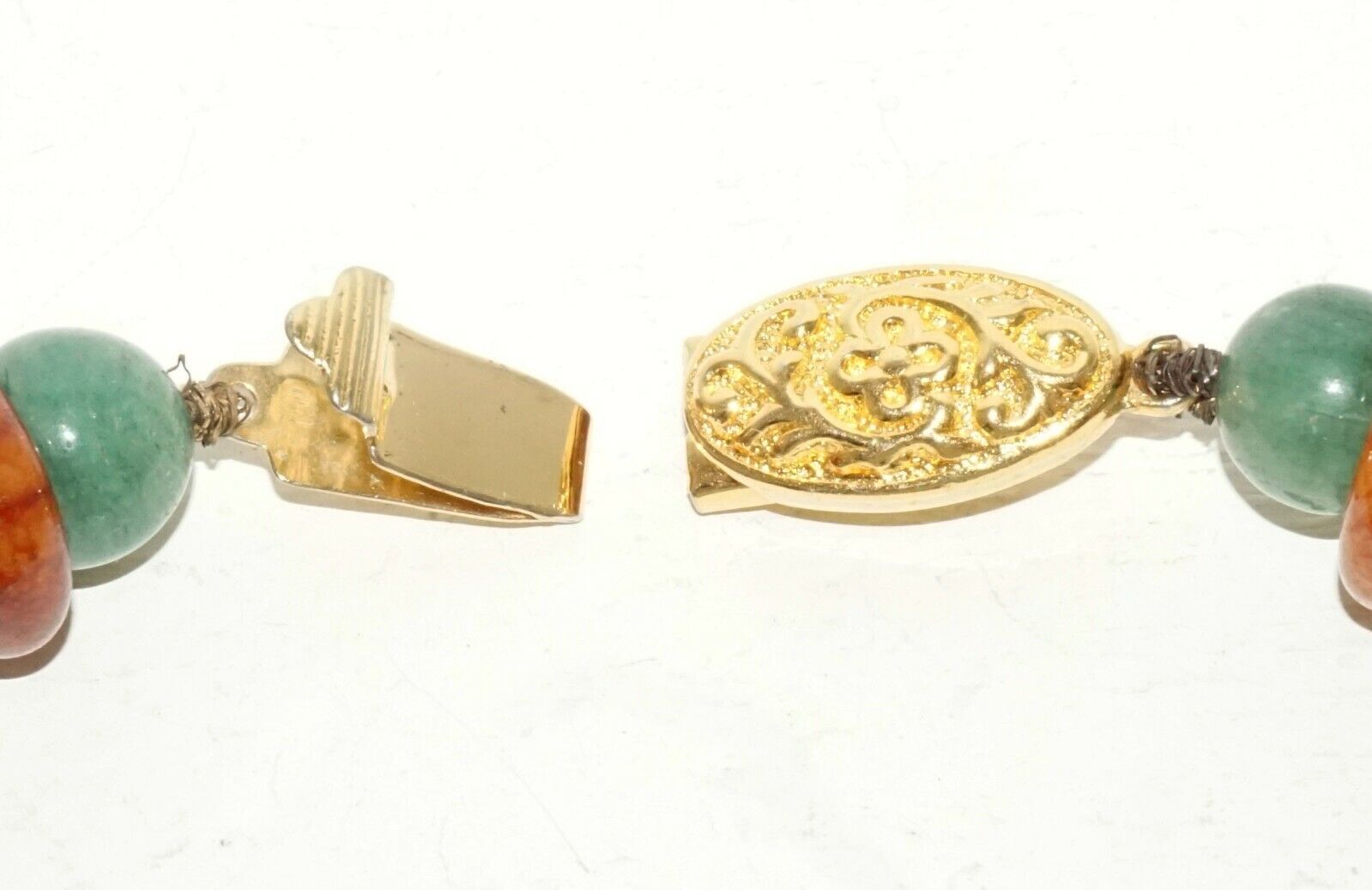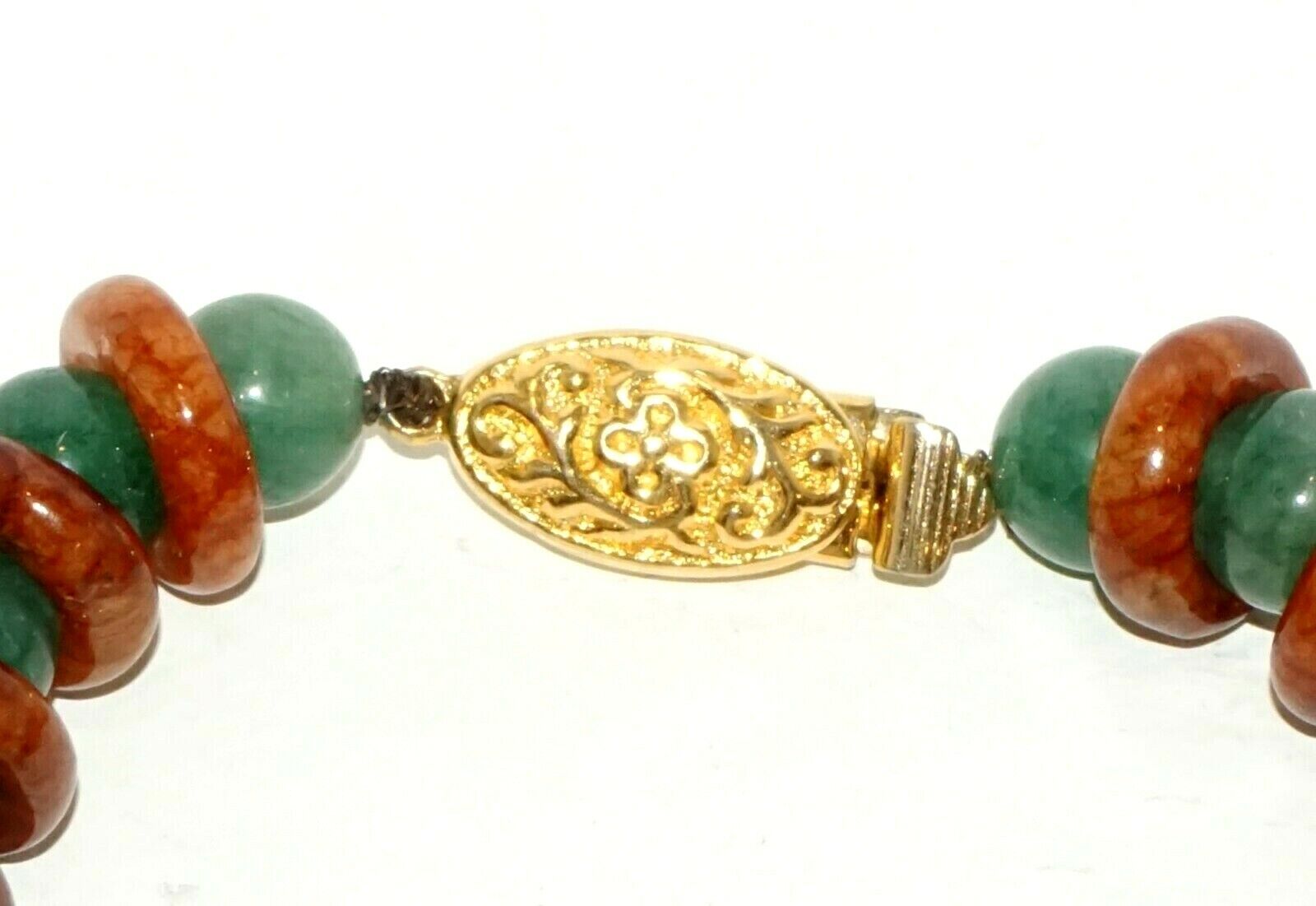 The item is overall in good pre-owned condition, the metal is gold colored but unmarked, all the stones were tested and are jade, we are unable to say if the jade was enhanced in any way