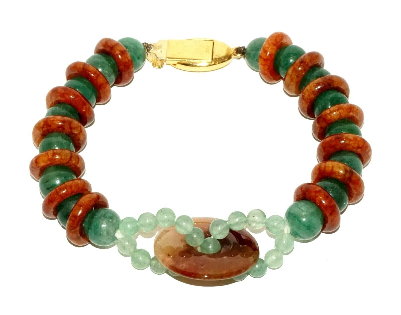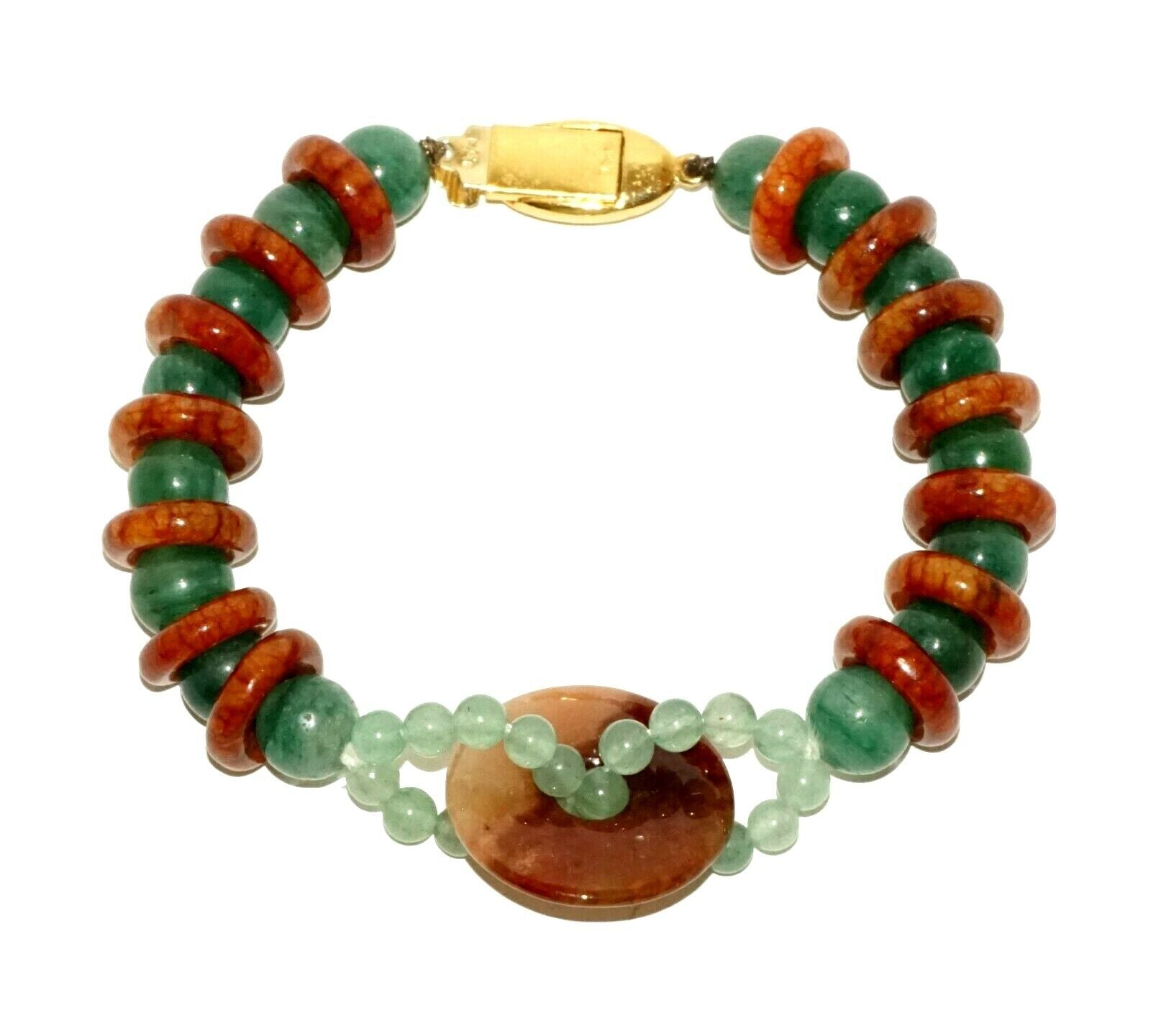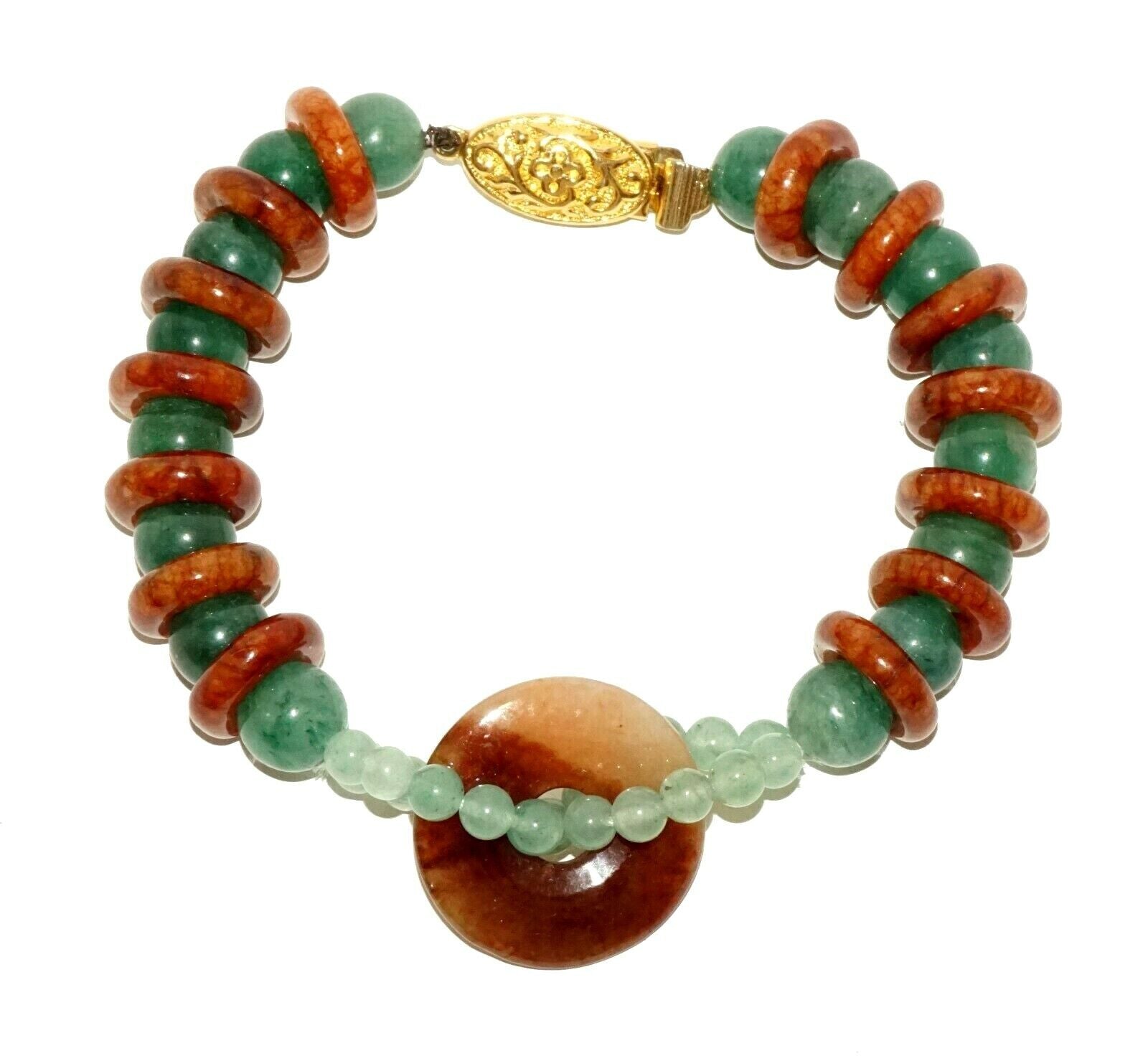 Up for sale from a recent client in Honolulu Hawaii, this Vintage Chinese green and red jadeite jade bead (range from 4mm to 8mm diameter) and ring (approx. 11mm diameter) design bracelet with a center red jade disk (approx. 22mm) accent. The condition is described above for more information please check the photos. The shipping rate includes tracking and for items over $500 signature confirmation. Please request insurance prior to paying for the item, it can be added at the buyers expense.