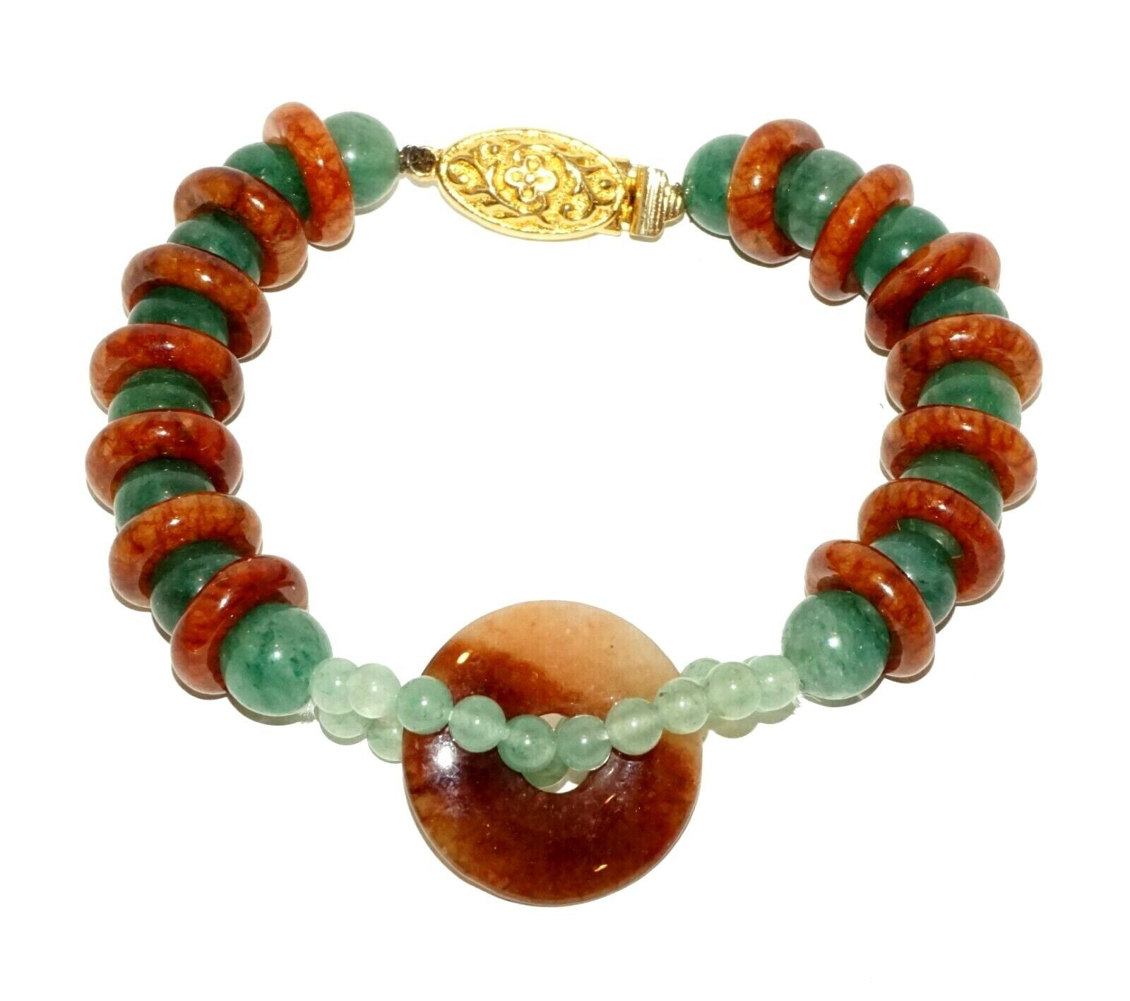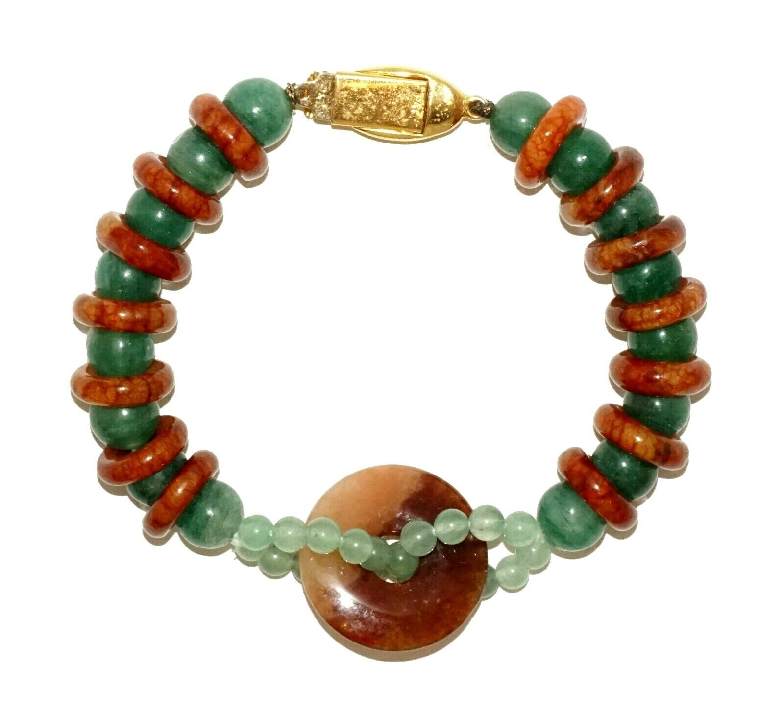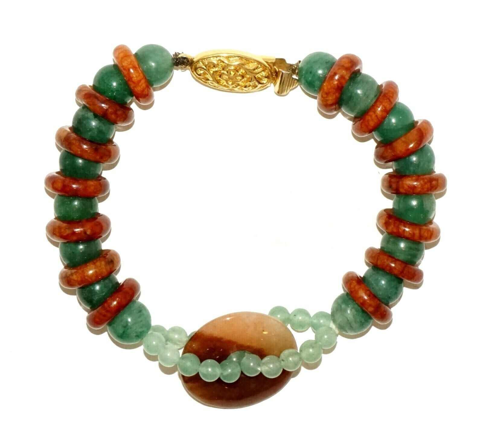 Up for sale from a recent client in Honolulu Hawaii, this Vintage Chinese green and red jadeite jade bead (range from 4mm to 8mm diameter) and ring (approx. 11mm diameter) design bracelet with a center red jade disk (approx. 22mm) accent. The condition is described above for more information please check the photos. The shipping rate includes tracking and for items over $500 signature confirmation. Please request insurance prior to paying for the item, it can be added at the buyers expense.