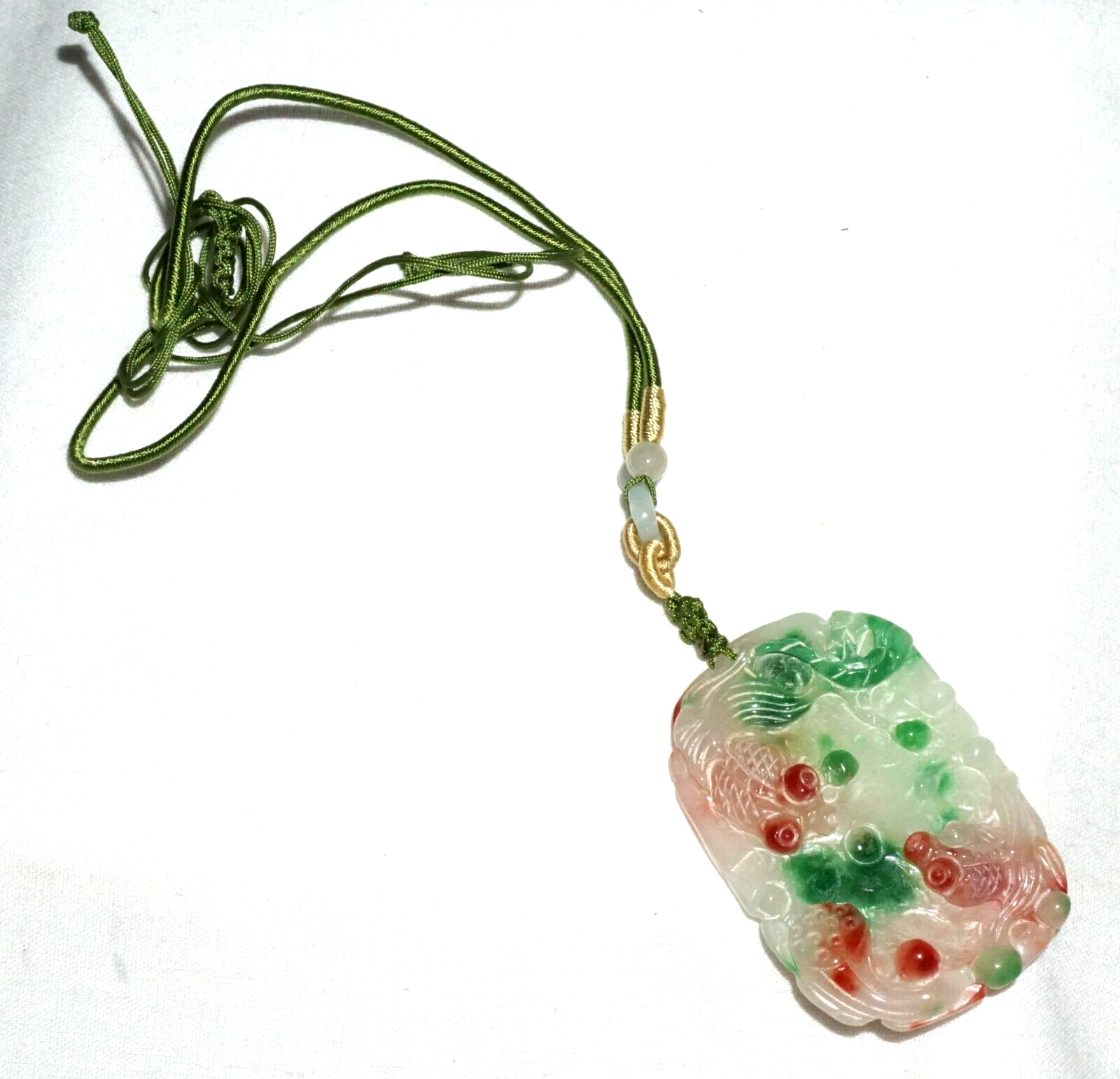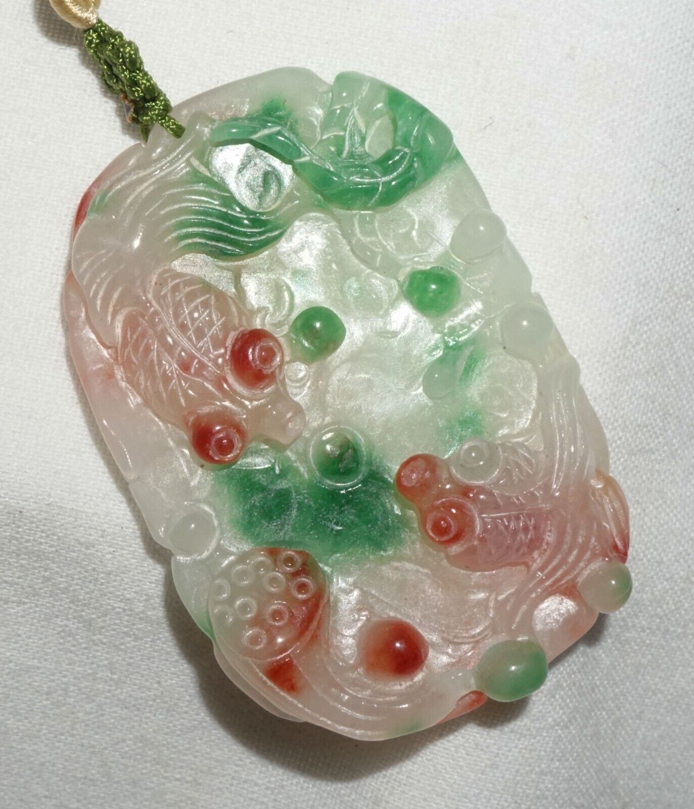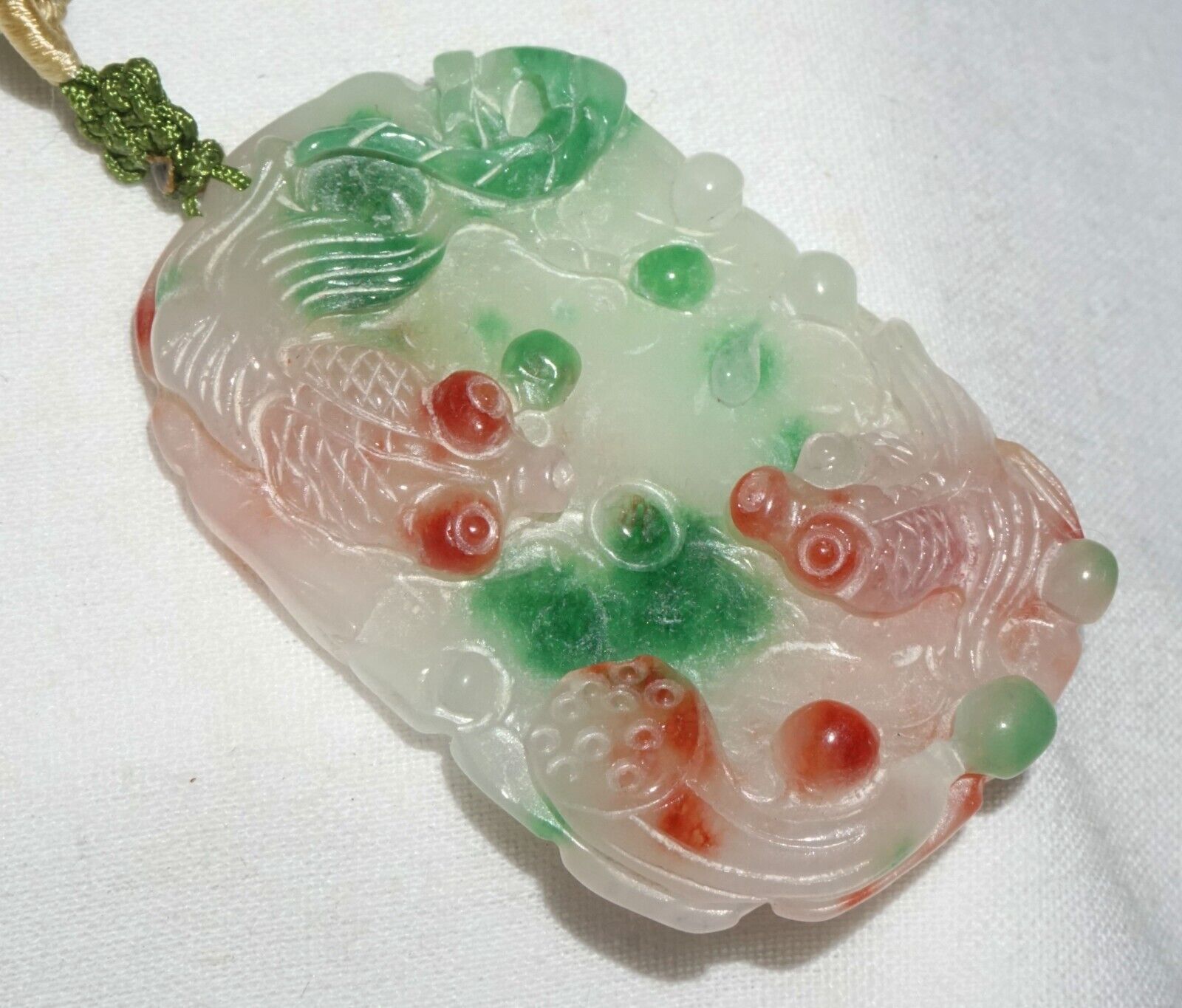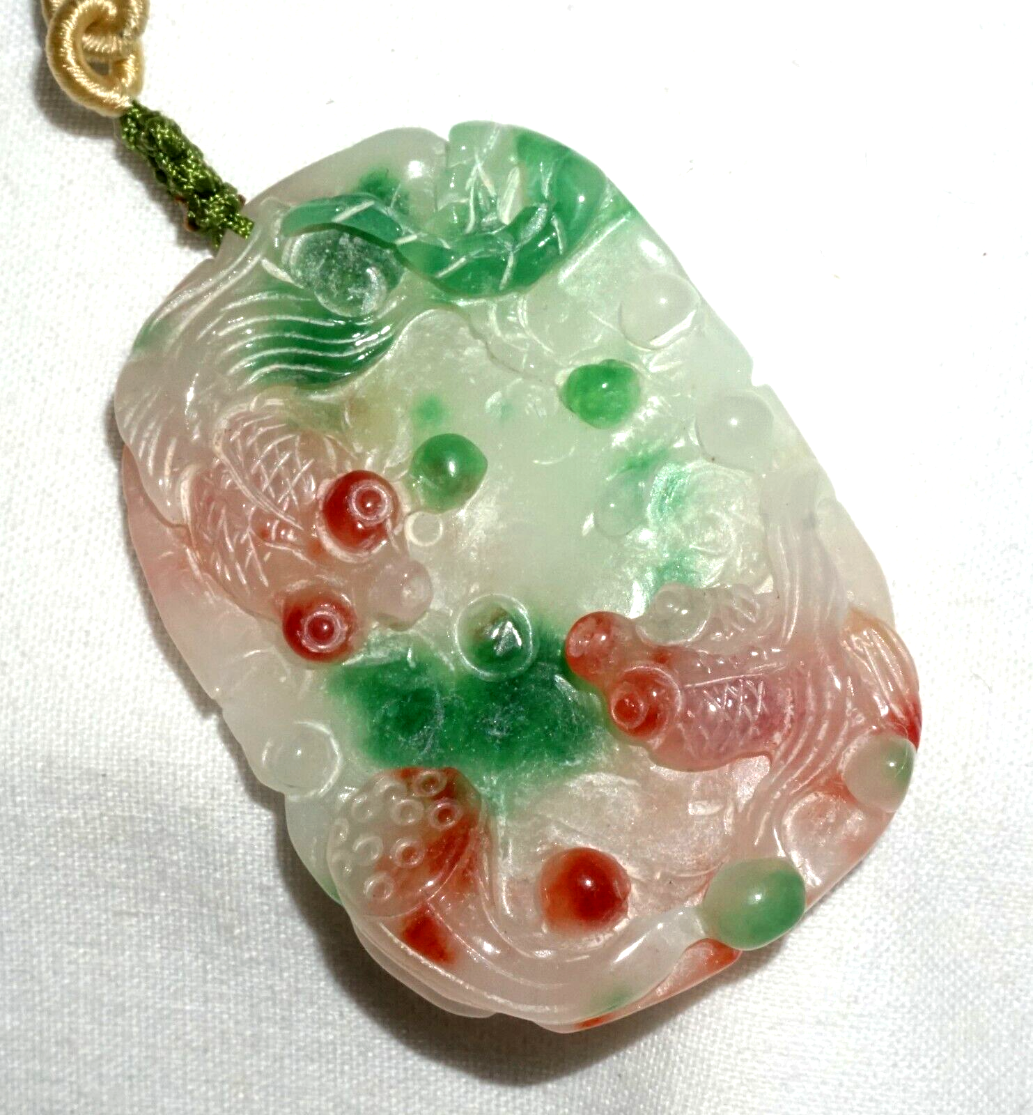 Vintage Chinese Semi Translucent Jadeite Jade Pendant w. Goldfish Motifs (---)