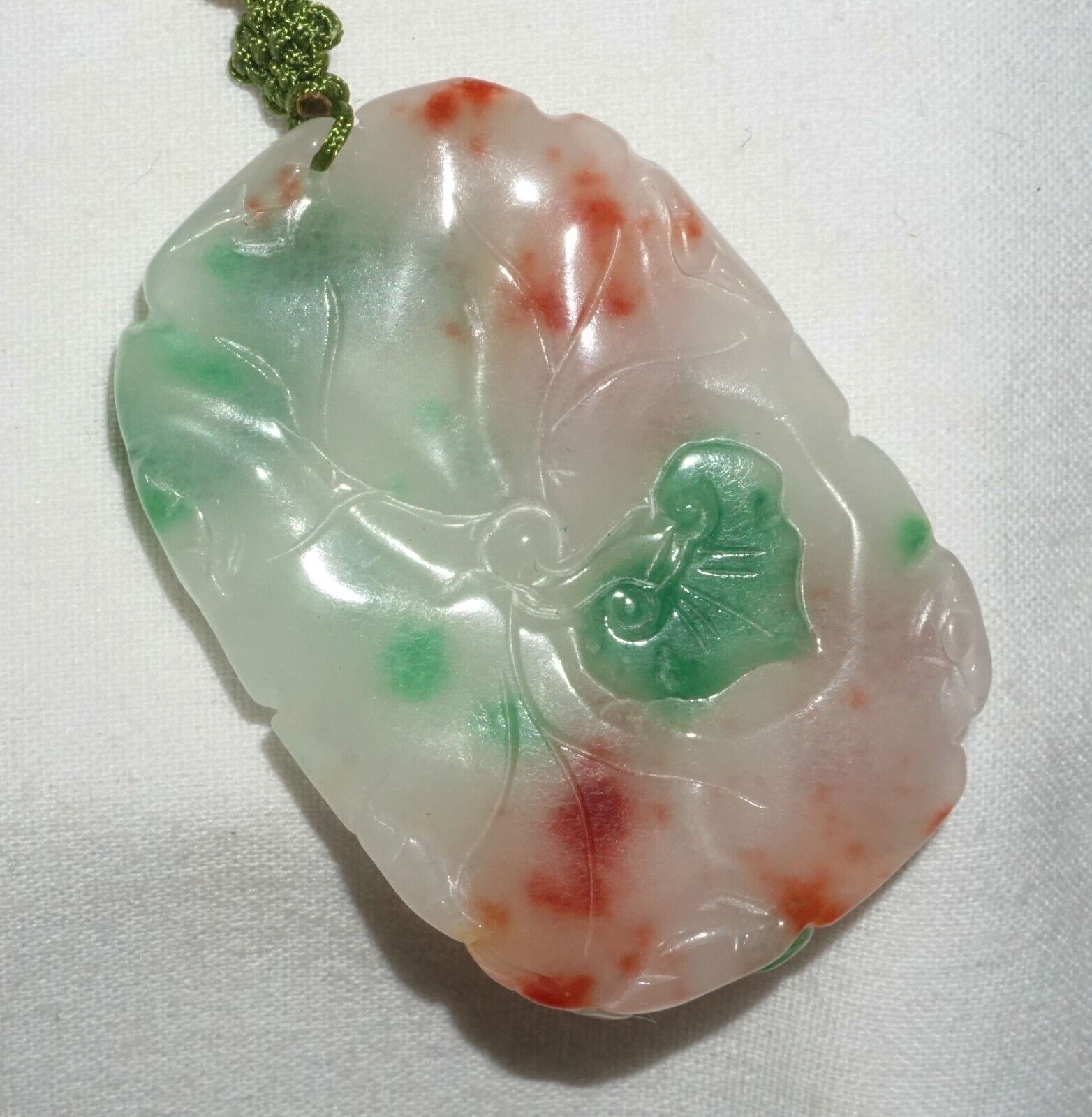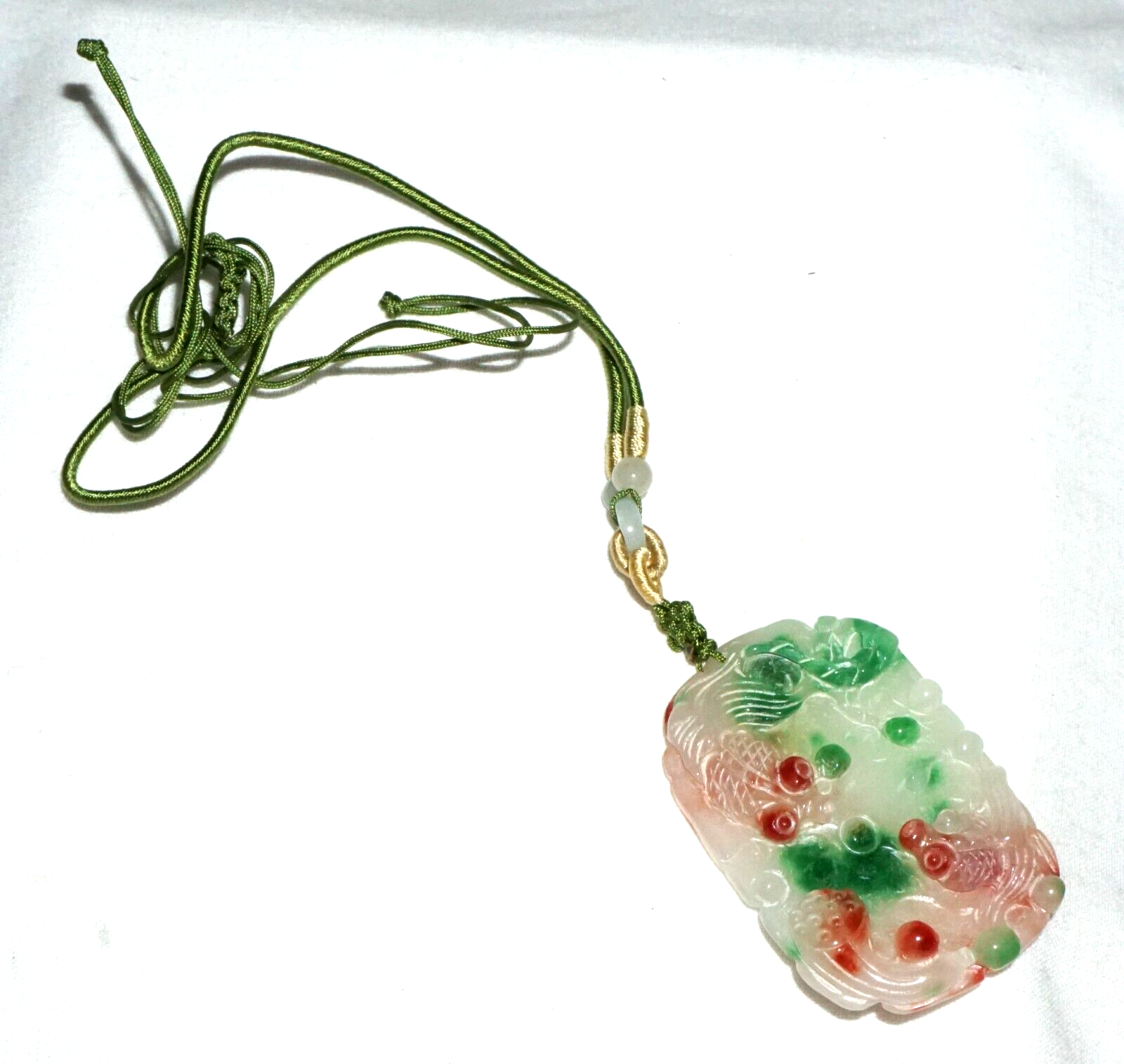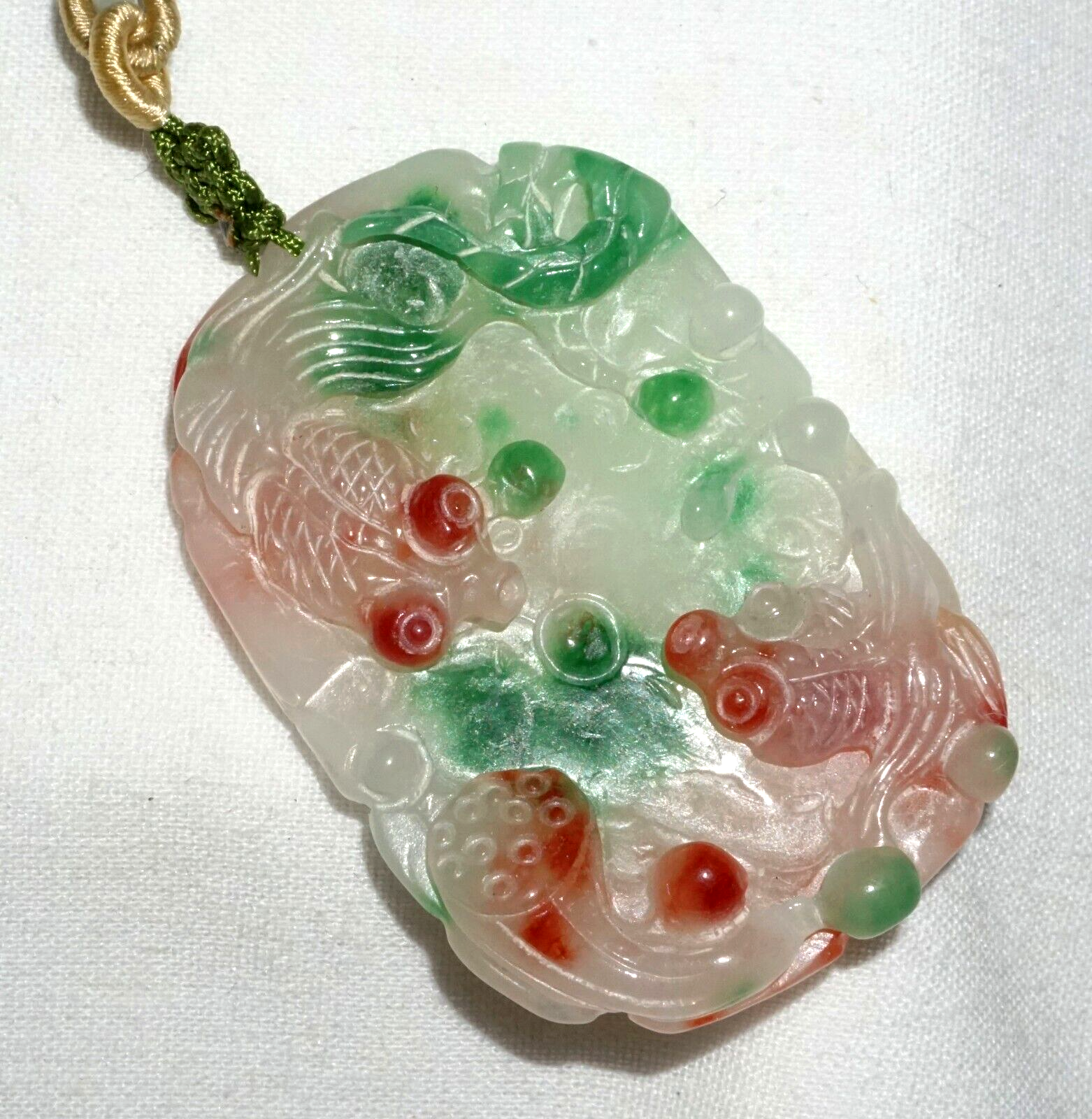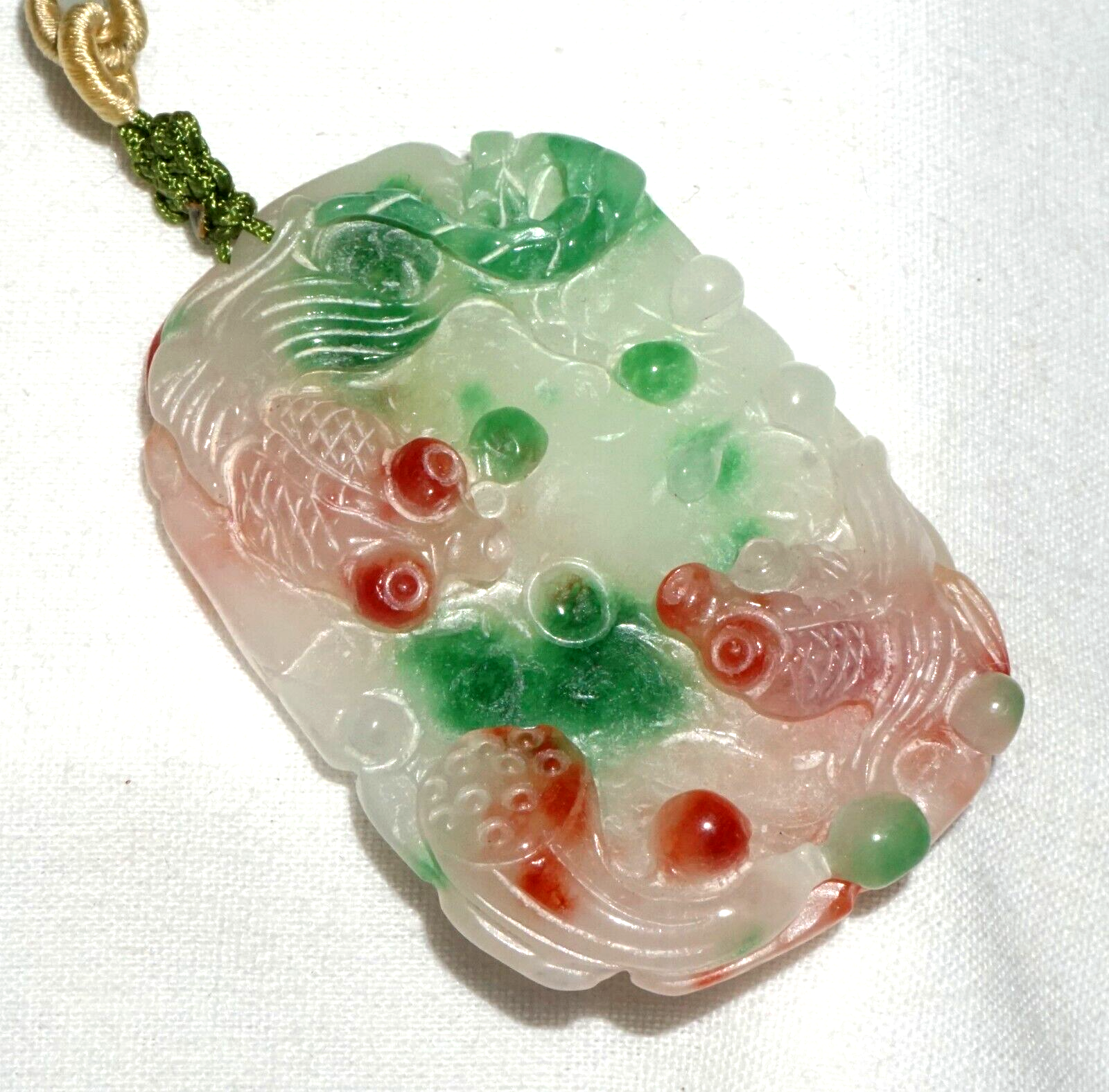 Up for sale from a recent client in Honolulu Hawaii, this Vintage Chinese semi translucent clear and red and green colored jadeite jade plaque pendant with a double gold fish and lotus motif carved in relief that is suspended from a cord necklace. The condition is described above for more information please check the photos. Free local pick up possible!!!