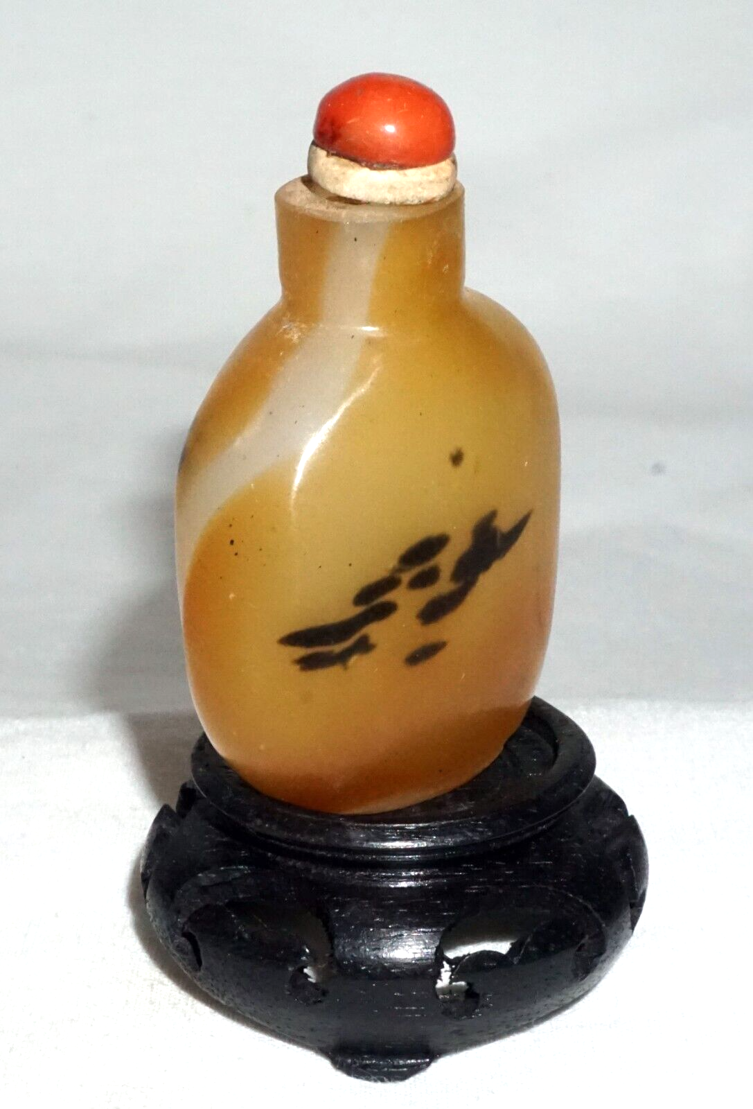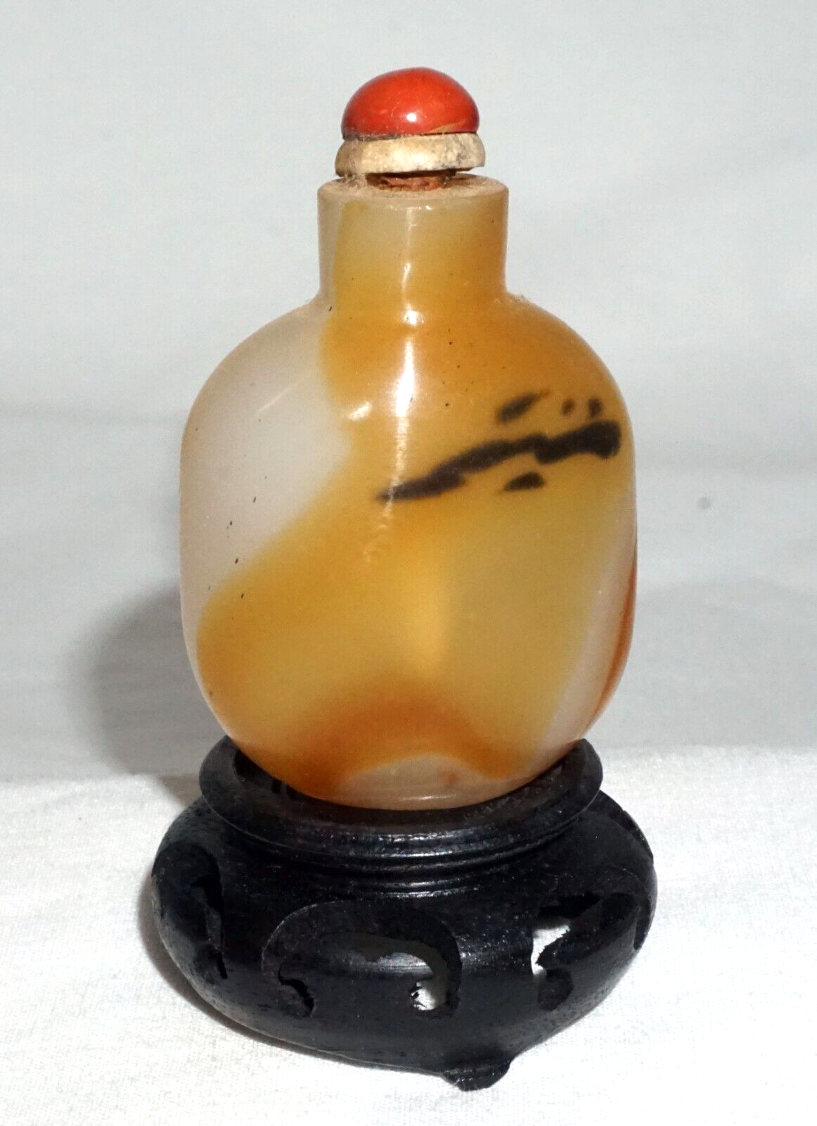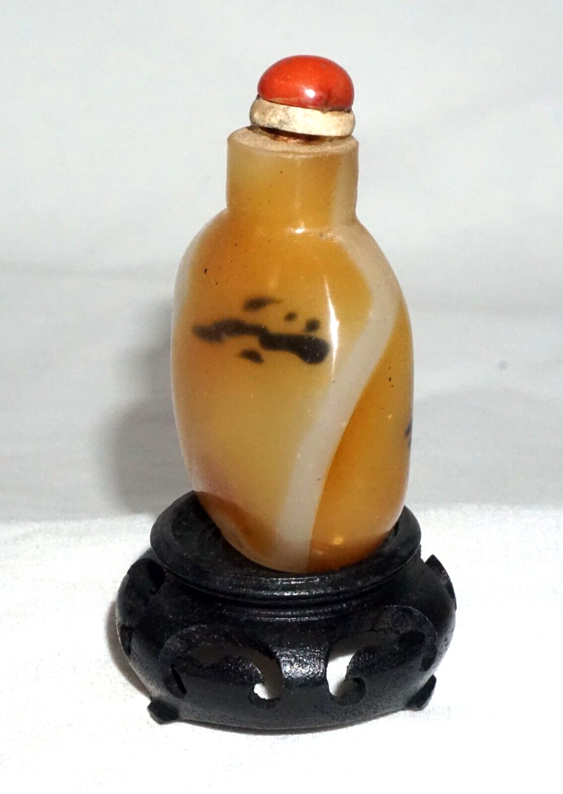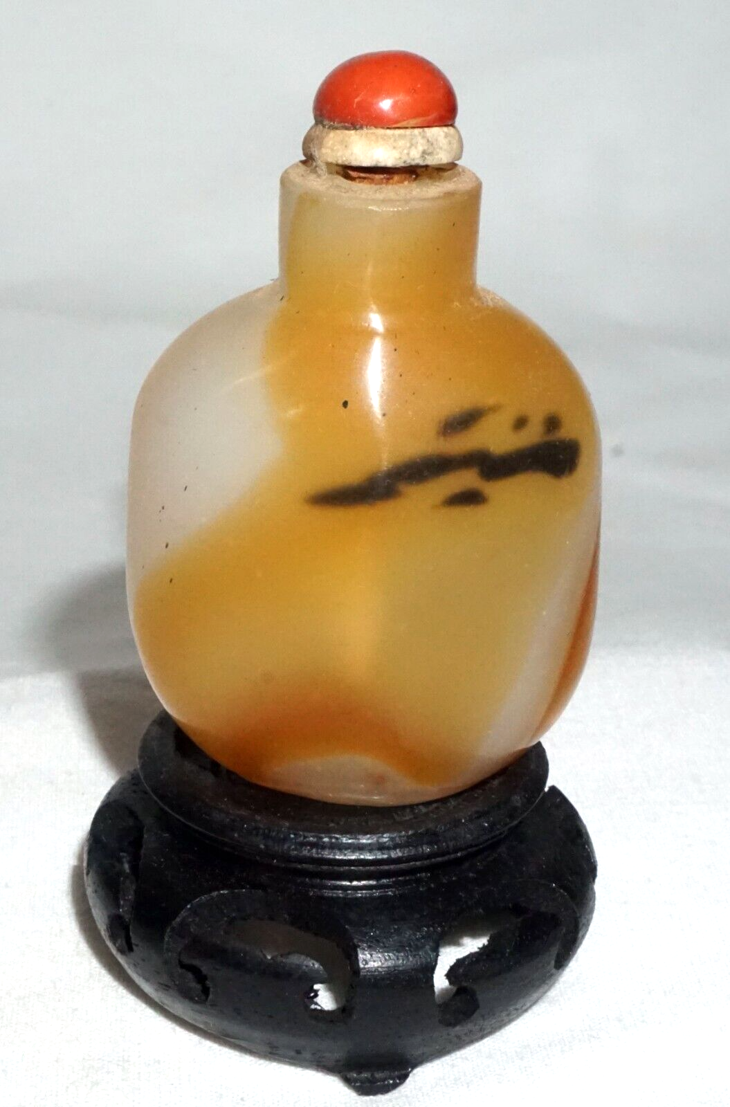 Up for sale from a recent client in Honolulu Hawaii, this Vintage Chinese shadow agate style glass snuff bottle under a coral stopper top. The bottle comes with a hardwood stand. The condition is described above for more information please check the photos. Free local pick up possible!!!
