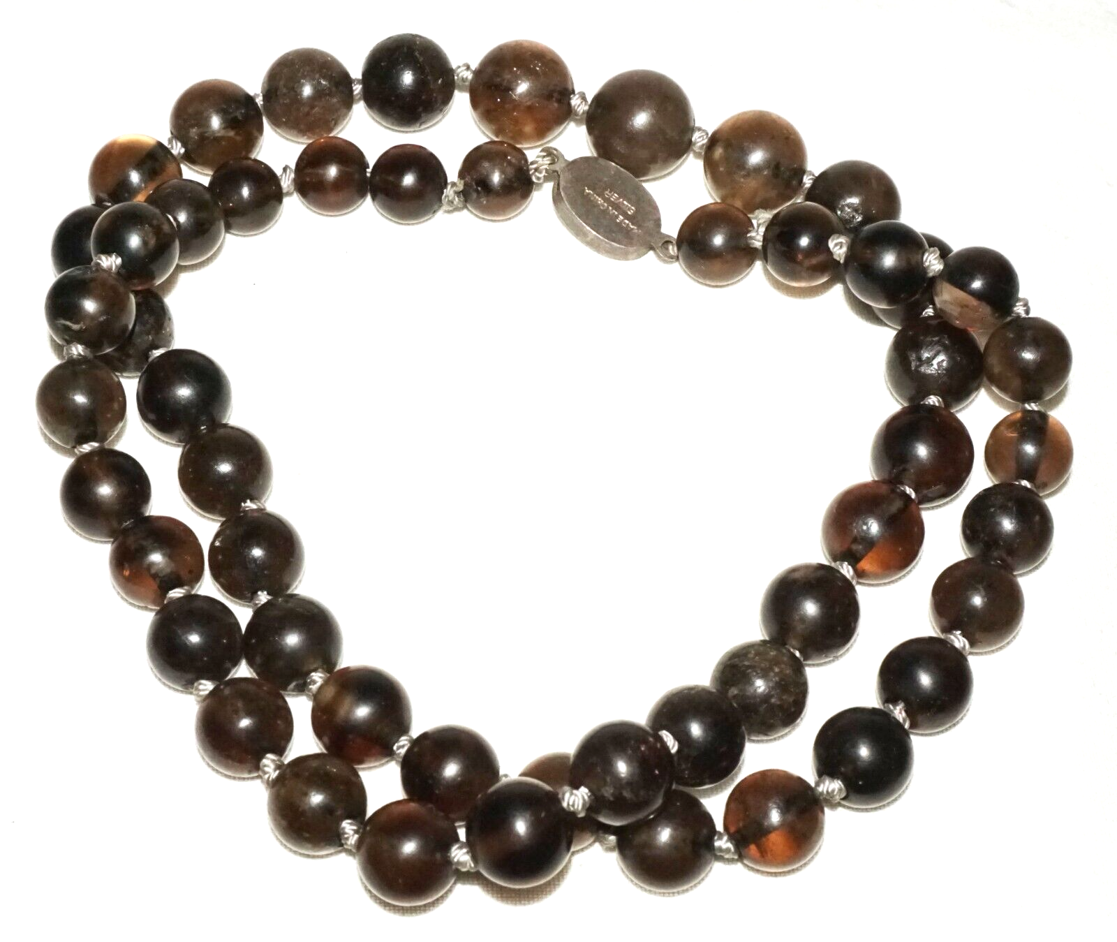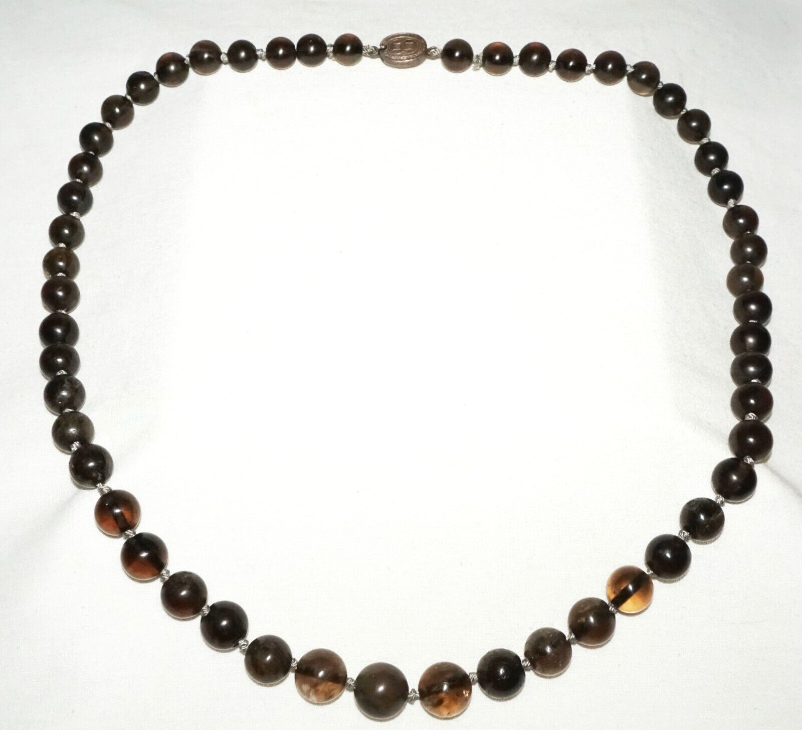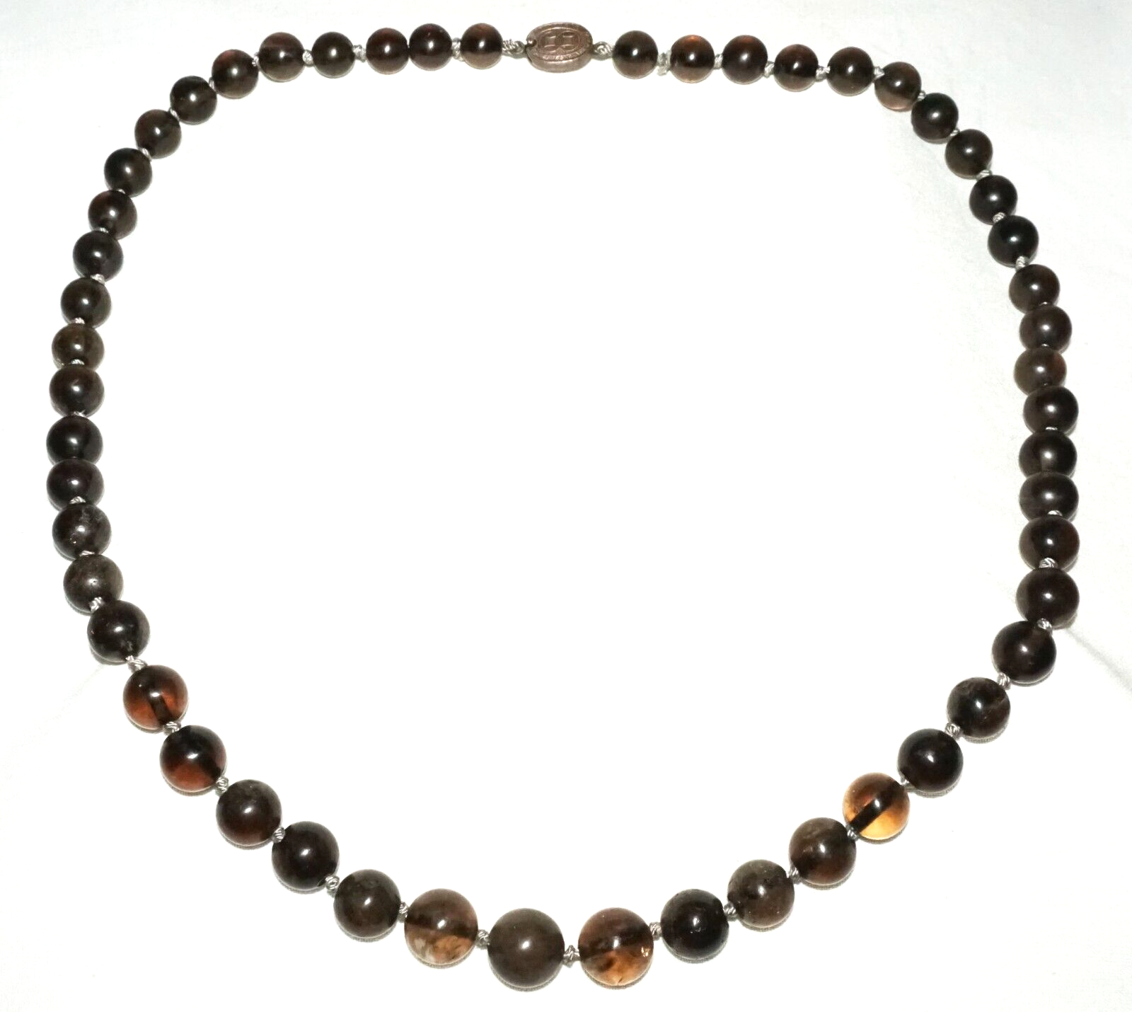 Vintage Chinese Smokey Quartz Bead Necklace w. Silver Clasp 25" (InS)#L2