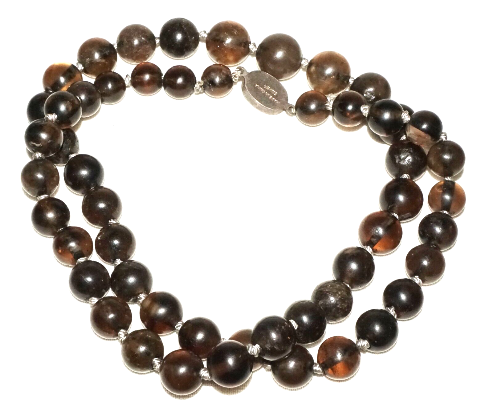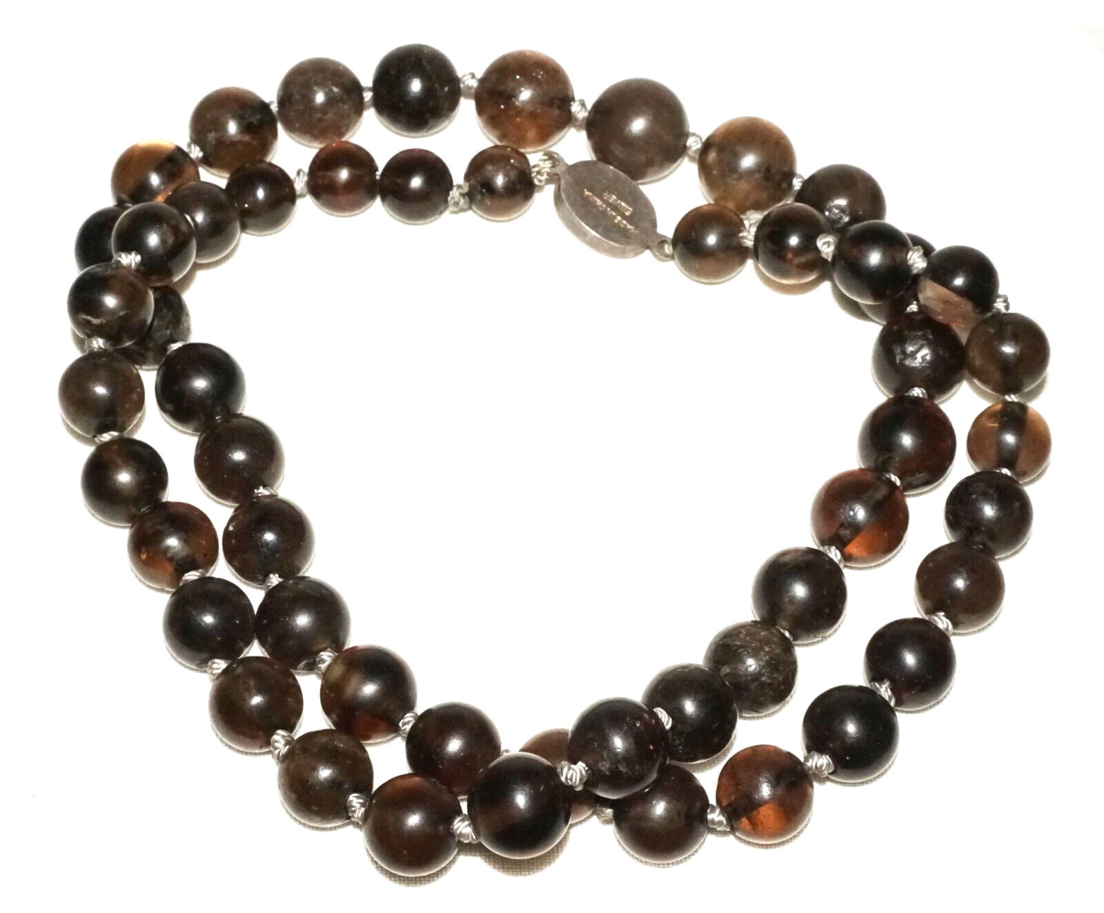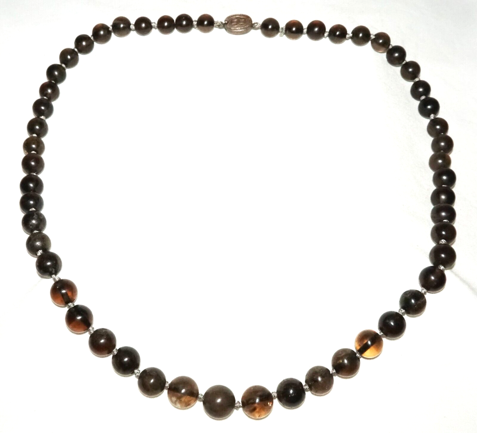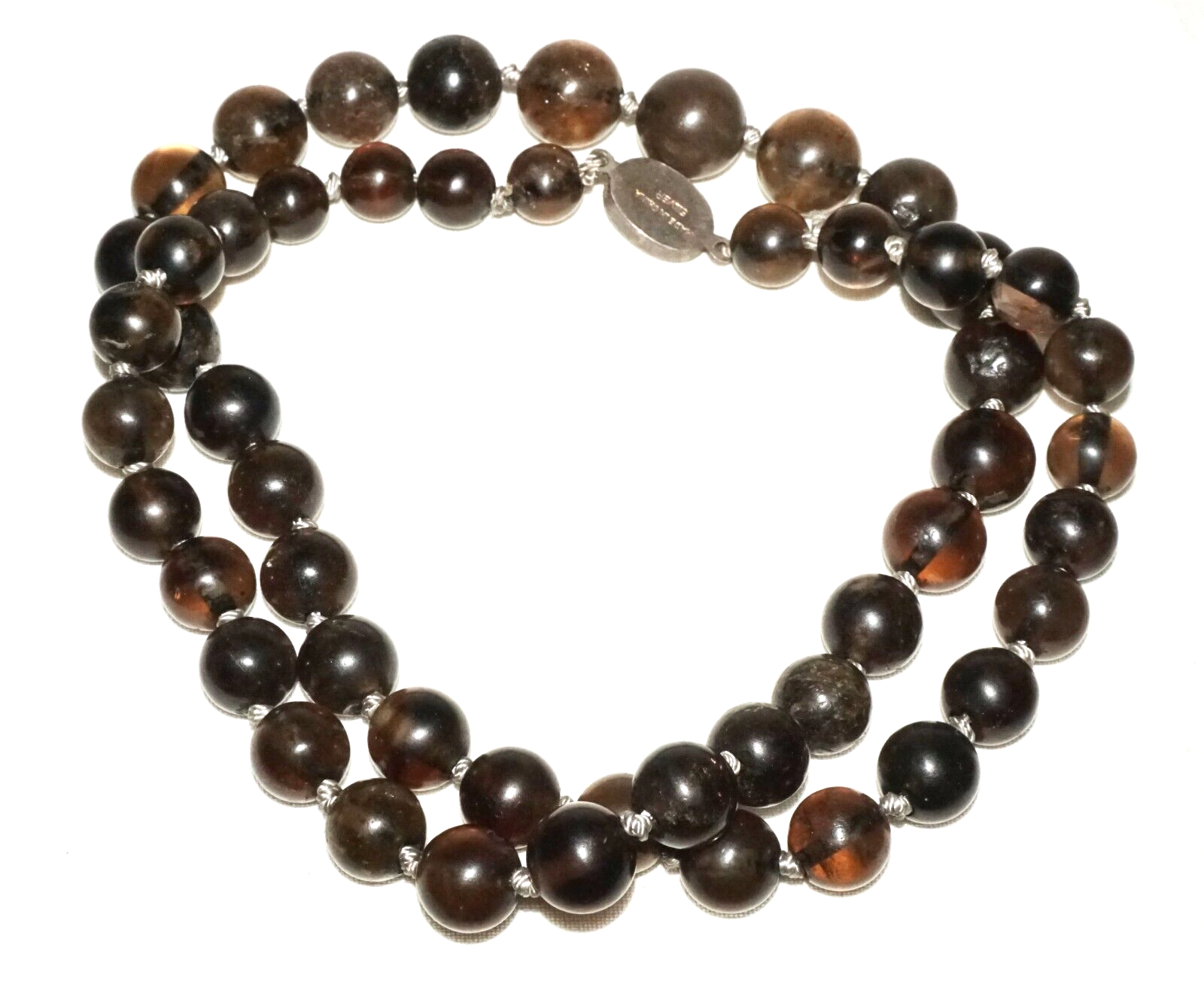 Vintage Chinese Smokey Quartz Bead Necklace w. Silver Clasp 25" (InS)#L2