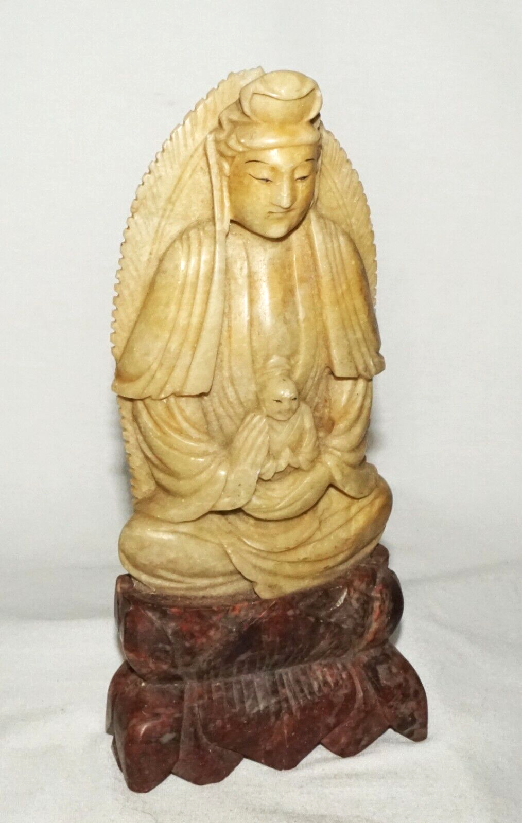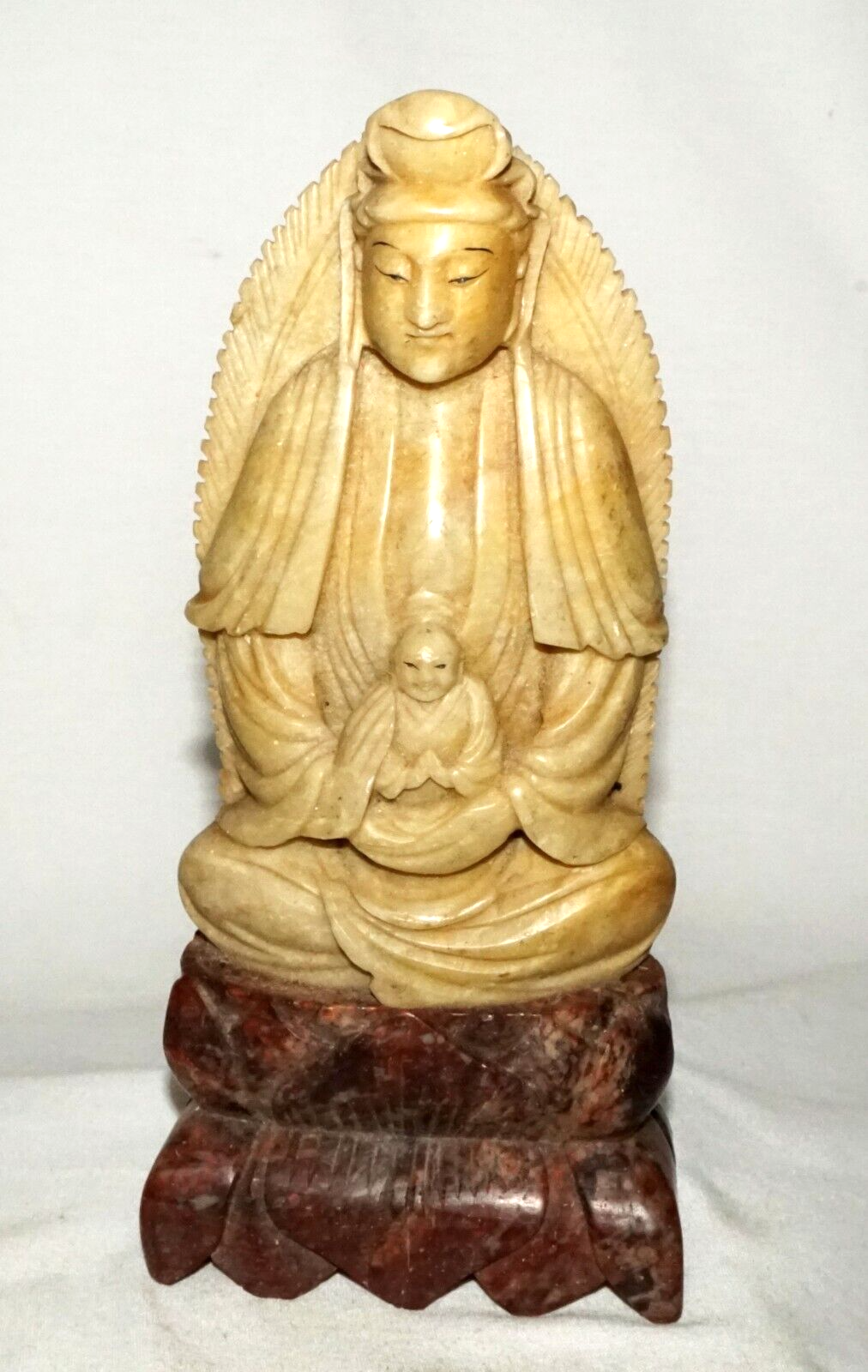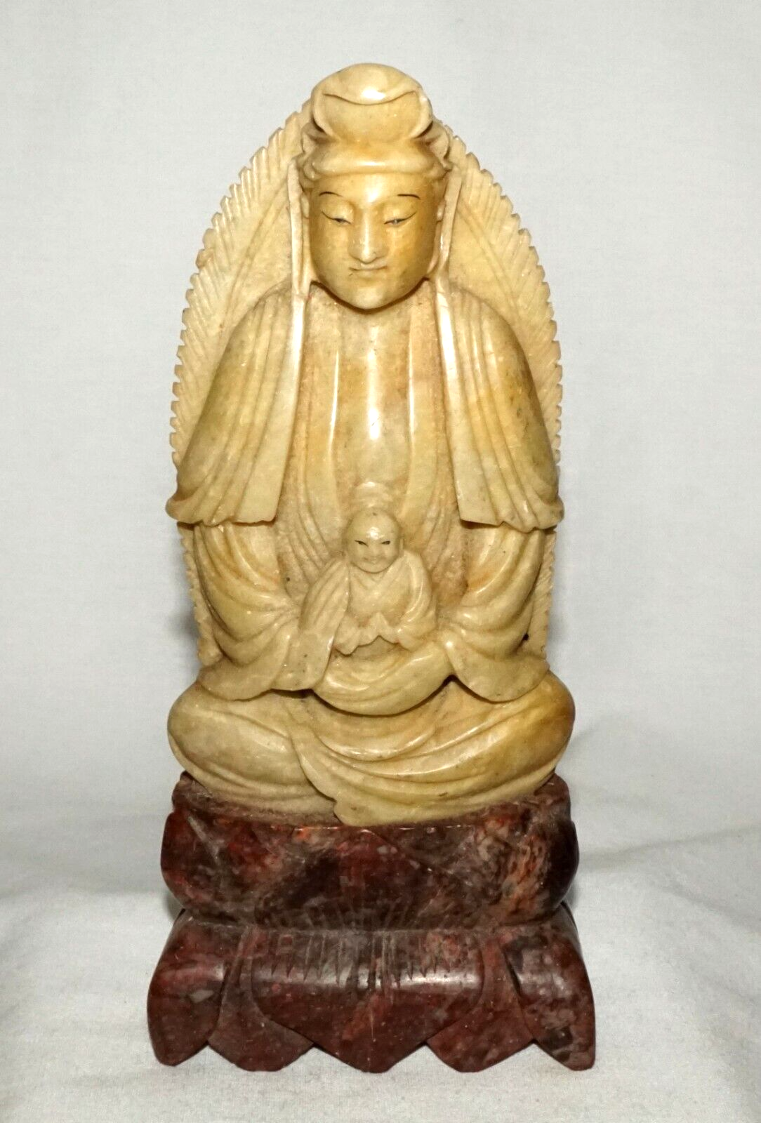 Up for sale from a recent estate in Honolulu Hawaii, this Vintage Chinese soapstone carved Buddha with a small seated figure in his hand perched on a lotus base. The condition is described above for more information please check the photos. Free local pick up possible!!!
