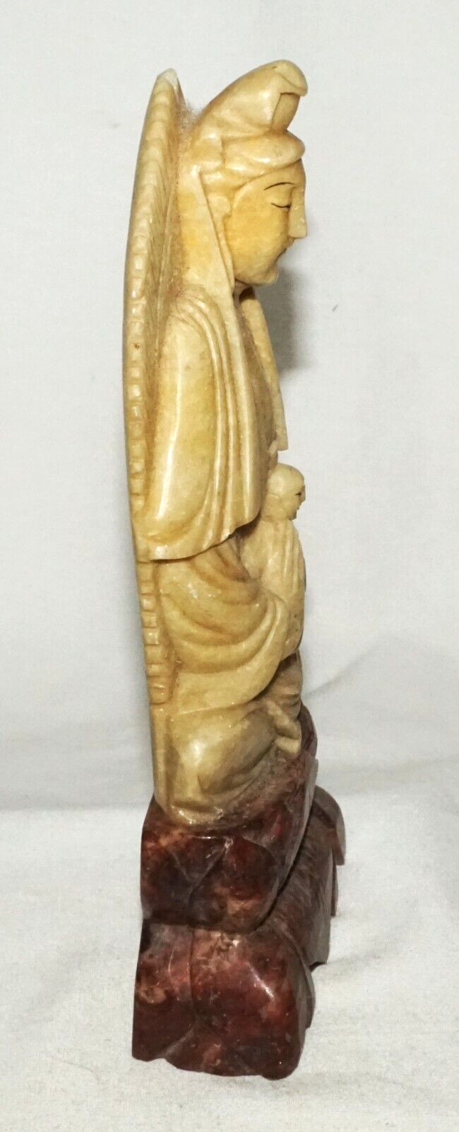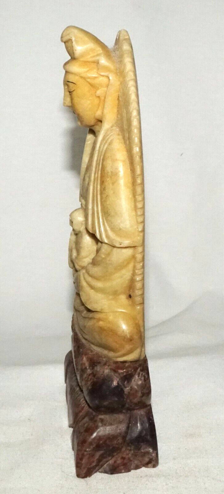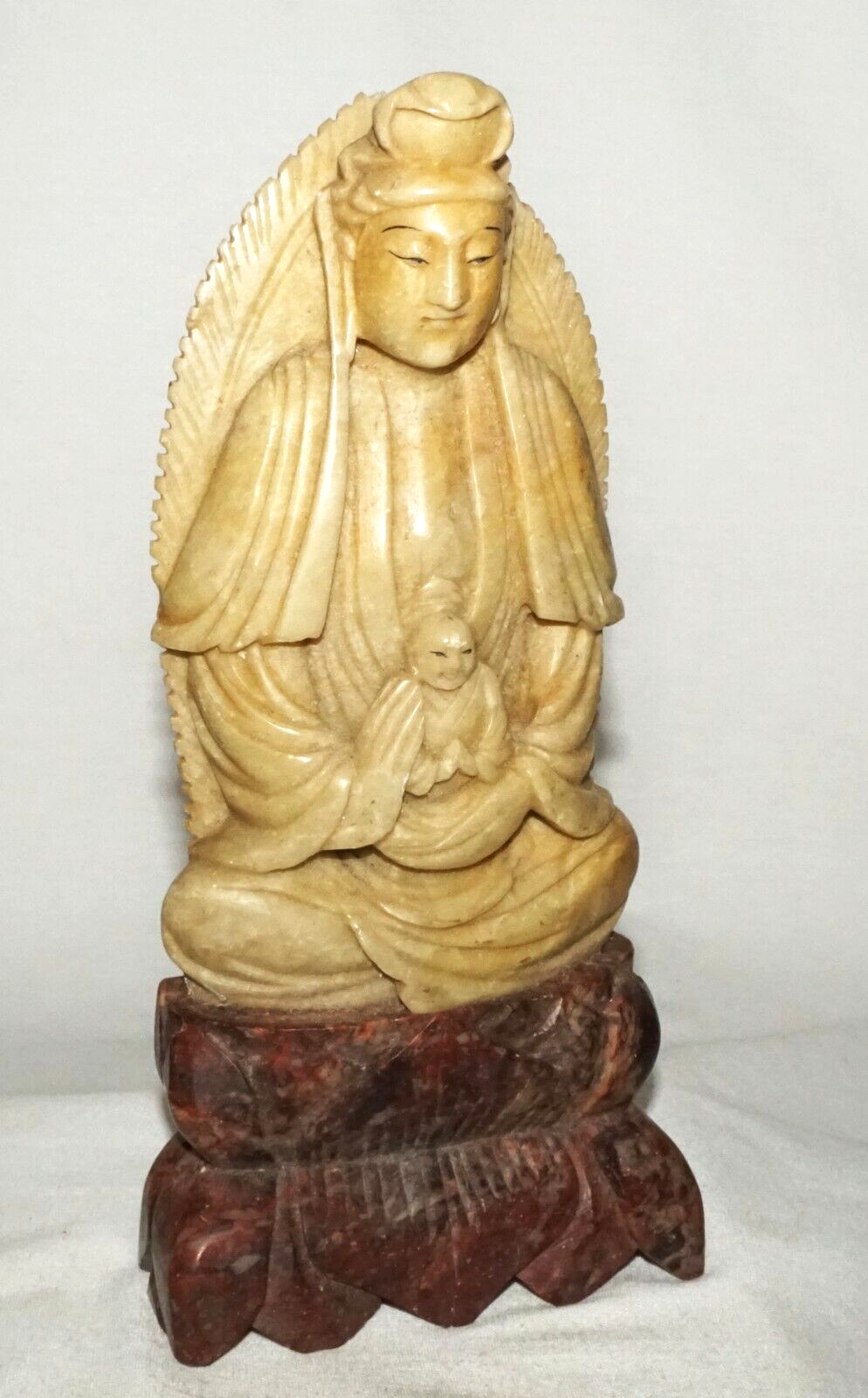 Up for sale from a recent estate in Honolulu Hawaii, this Vintage Chinese soapstone carved Buddha with a small seated figure in his hand perched on a lotus base. The condition is described above for more information please check the photos. Free local pick up possible!!!