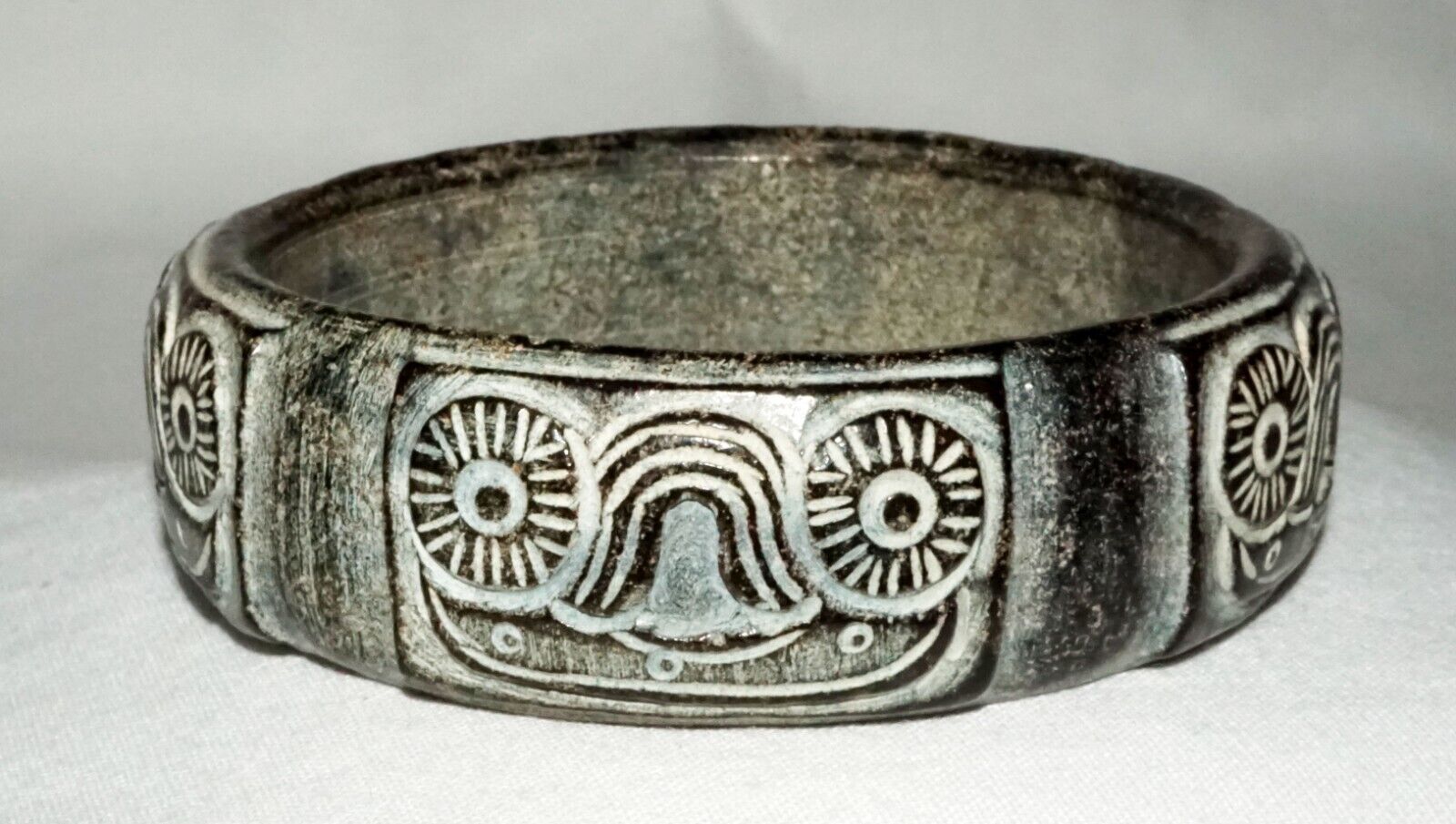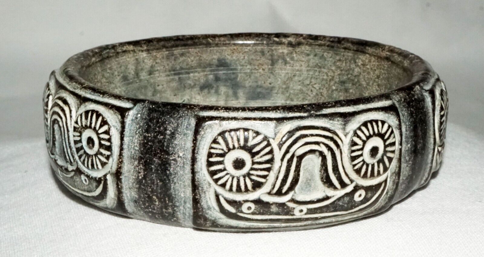 Up for sale from a recent estate in Honolulu Hawaii, this Vintage Chinese steatite bangle bracelet with an archaistic motif carved in relief. The condition is described above for more information please check the photos. Free local pick up possible!!!