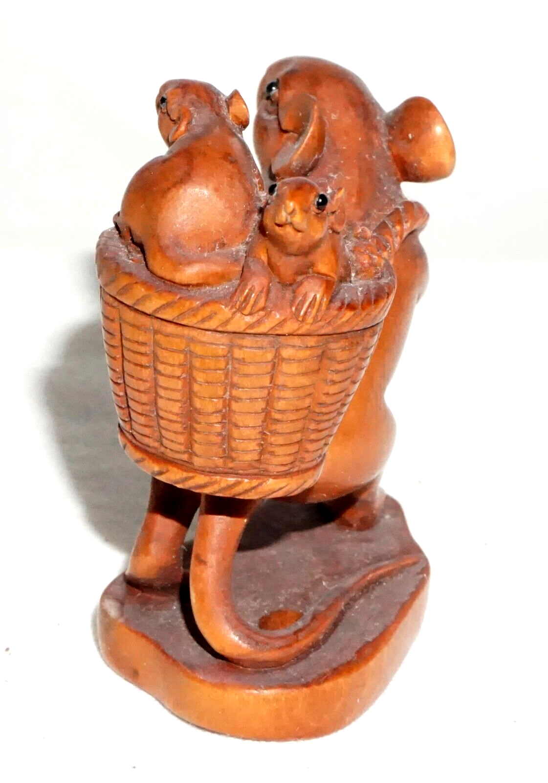 Vintage Japanese Carved Wooden Netsuke Mouse w. Basket & Babies (FeH
